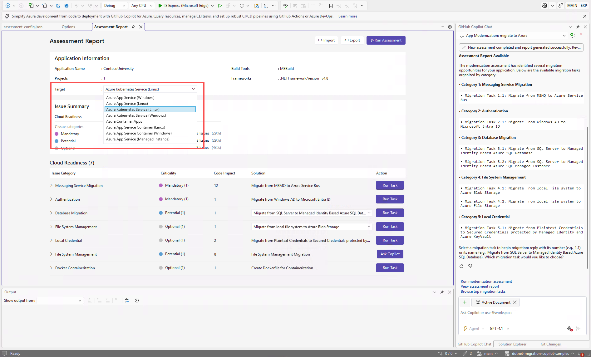 After the assessment runs, the interactive dashboard opens automatically to provide comprehensive analysis results. When you configure the target Azure service as Any, you can switch between them to compare migration approaches and view service-specific recommendations. If you configure a specific target Azure service, you can only see one Azure service in the dropdown list.