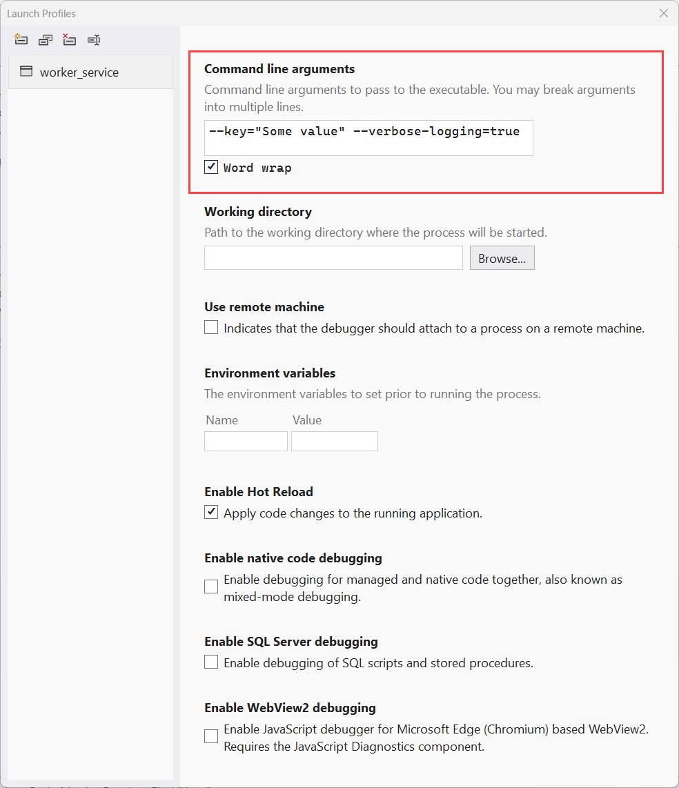 With Visual Studio 2019 and later, you can specify command-line arguments using the Launch Profiles dialog.
