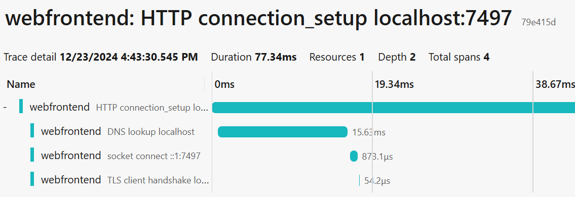 As mentioned previously, the HTTP connection_setup span is a separate span with its own TraceId, as its lifetime is independent from each individual client request. This span typically has child spans DNS lookup, (TCP) socket connect, and TLS client handshake.