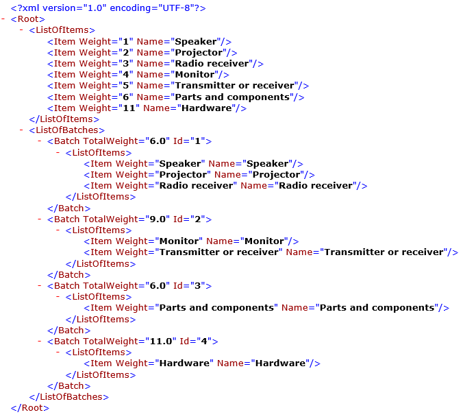 I illustrasjonene nedenfor er det samme formatet justert slik at det viser listen over artikkelvarer i partier hvis et enkelt parti må inneholde artikler, og den totale vekten må ikke overskride grensen på 9.