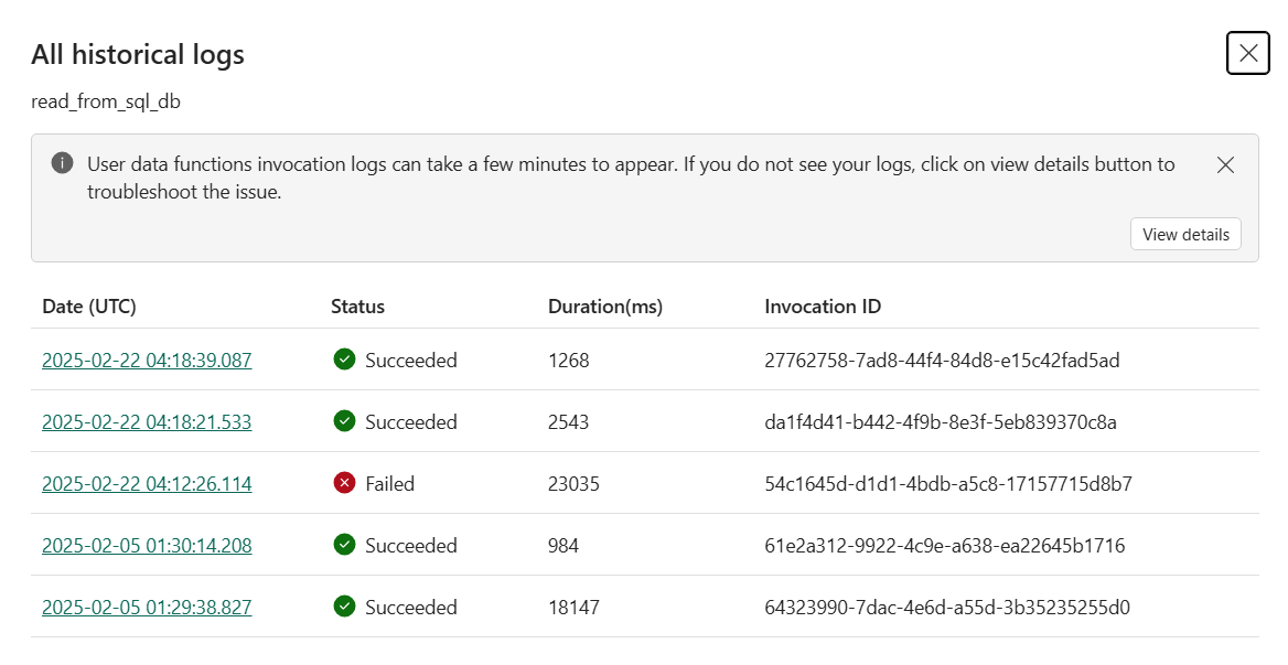 Den historiske loggvisningen viser nylige kall for den valgte funksjonen. Du kan se opptil 50 oppføringer, og logger lagres i 30 dager. Velg dato-lenken i Dato-kolonnen (UTC) for å se detaljerte logger for en spesifikk påkallelse.