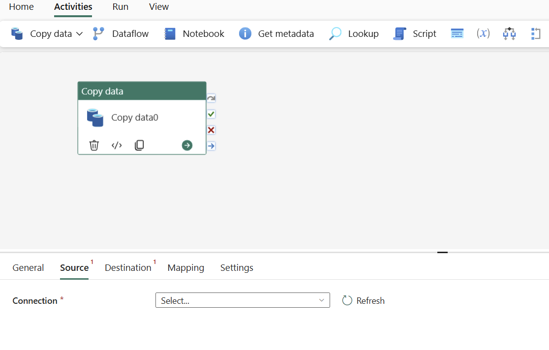 Legg til en kopiaktivitet enten ved å velge Legg til aktivitet for datasamlebånd>, kopier aktivitet eller ved å velge Kopier data>Legg til på lerret under Aktiviteter-fanen.