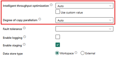 Dynamisk område med en grad av parallelle kopier kan forbedre ytelsen betydelig. Hvis du bruker innstillingen, må du imidlertid forhåndsdefinere grensene eller la tjenesten bestemme verdiene ved kjøretid. Å tillate tjenesten å bestemme verdiene ved kjøretid kan påvirke total varighet, avhengig av DDL og datavolumet i kildetabellen. I tillegg bør det å la tjenesten bestemme verdiene ved kjøretid også være sammenkoblet med en forståelse av hvor mange parallelle kopier kilden kan håndtere. Hvis verdien er for høy, kan kildesystemet og kopieringsaktivitetsytelsen reduseres.