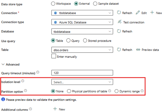 Når kilden er en relasjonsdatabase som Azure SQL-database, kan du angi et partisjonsalternativ under Avansert. Som standard er denne innstillingen satt til Ingen, med to andre alternativer for fysiske partisjoner av tabellen og dynamisk område.