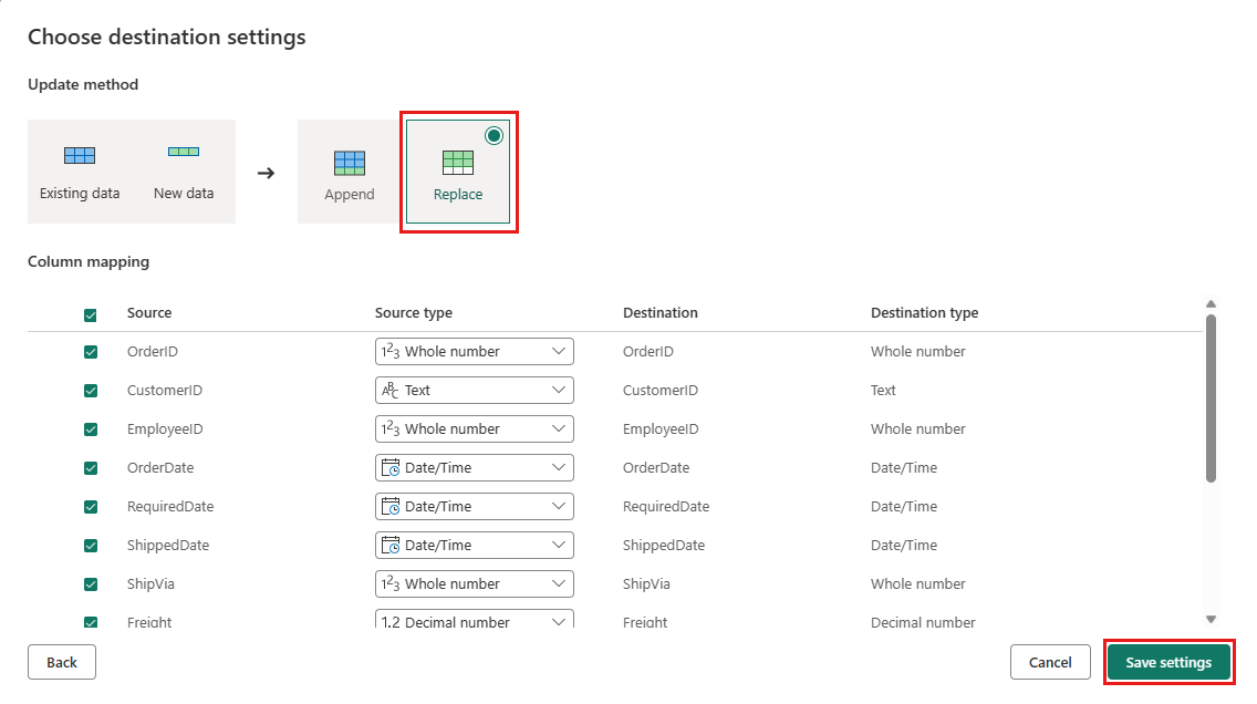 Konfigurer datamålet til lakehouse ved hjelp av følgende innstillinger: