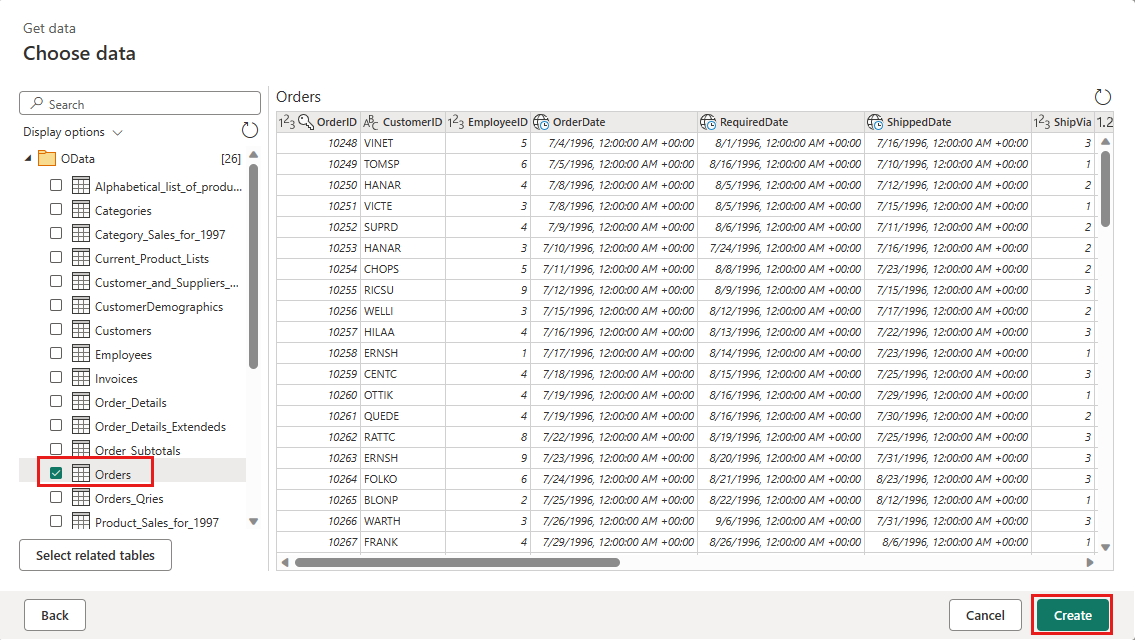 Velg Ordrer-tabellen, og velg Neste.