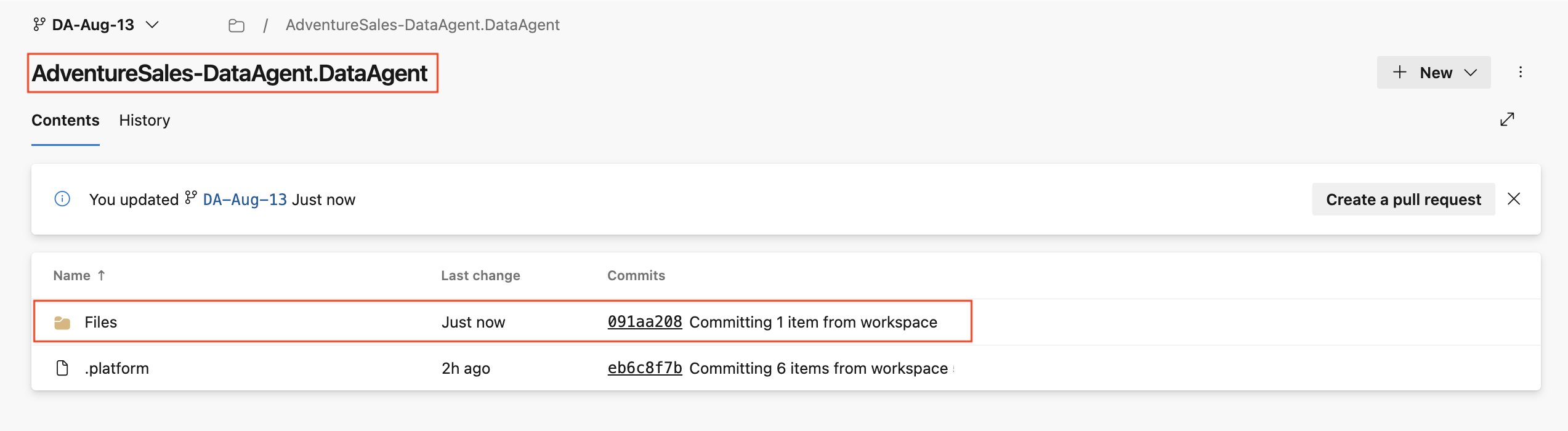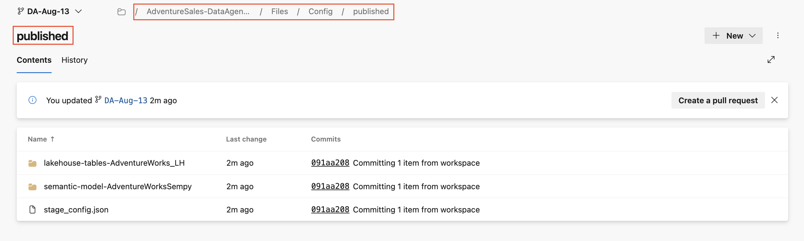 1. Det koblede Git-repositoriet viser en mappestruktur som representerer arbeidsområdeelementene, inkludert Fabric-dataagenter og deres konfigurasjonsfiler. Hver dataagent lagres i sin egen mappe, slik at du kan se gjennom endringer, spore versjonslogg og bruke Git-arbeidsflyter, for eksempel å opprette pull-forespørsler for å slå sammen oppdateringer til hovedgrenen.