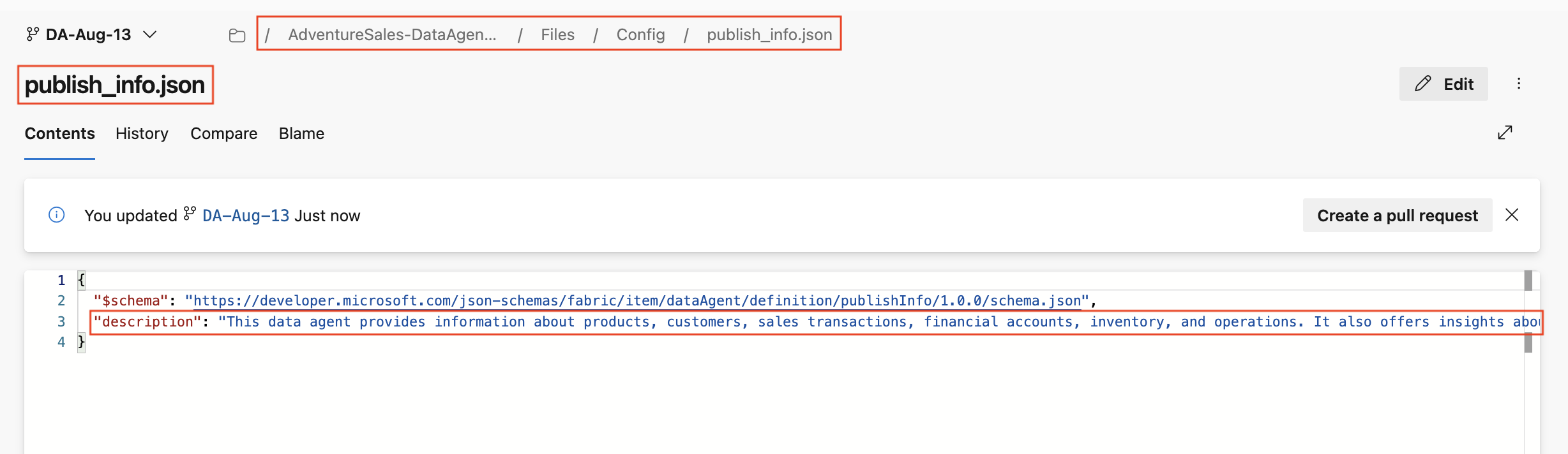 I konfigurasjonsmappen inneholder publish_info.json publiseringsbeskrivelsen for dataagenten. Denne filen kan oppdateres for å endre beskrivelsen som vises når dataagenten publiseres.