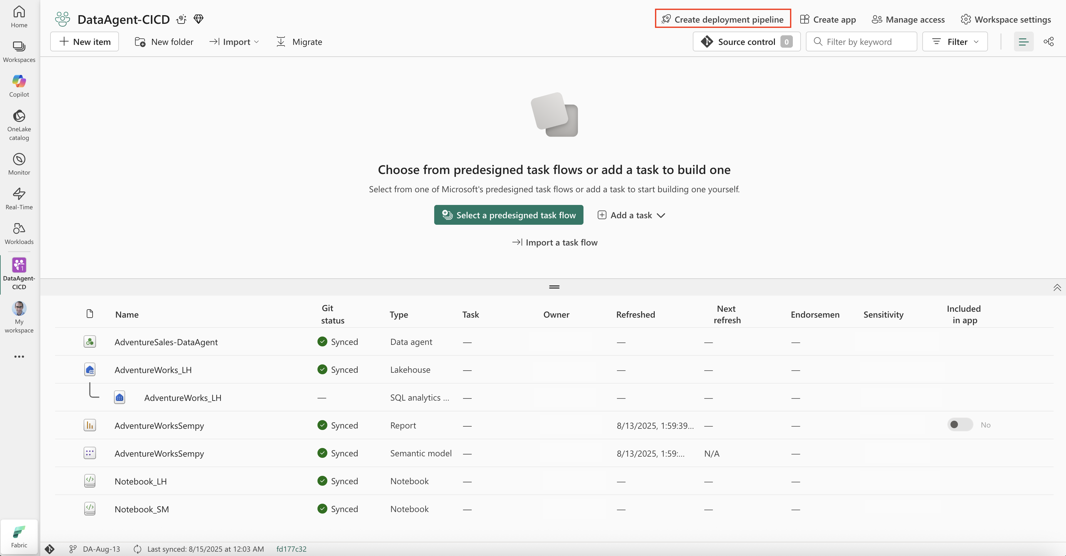 2. Når du har koblet til Git-repositoriet, vises arbeidsområdeelementene, inkludert Fabric-dataagenter, i Kilde-kontrollpanelet. På statuslinjen nederst til venstre kan du se navnet på den tilkoblede grenen, tidspunktet for siste synkronisering og Git-commit-ID-en.