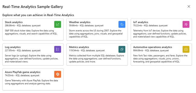 Skjermbilde av eksempelgalleriet for Real-Time intelligence som viser eksempeldatabaser som er tilgjengelige for inntak.