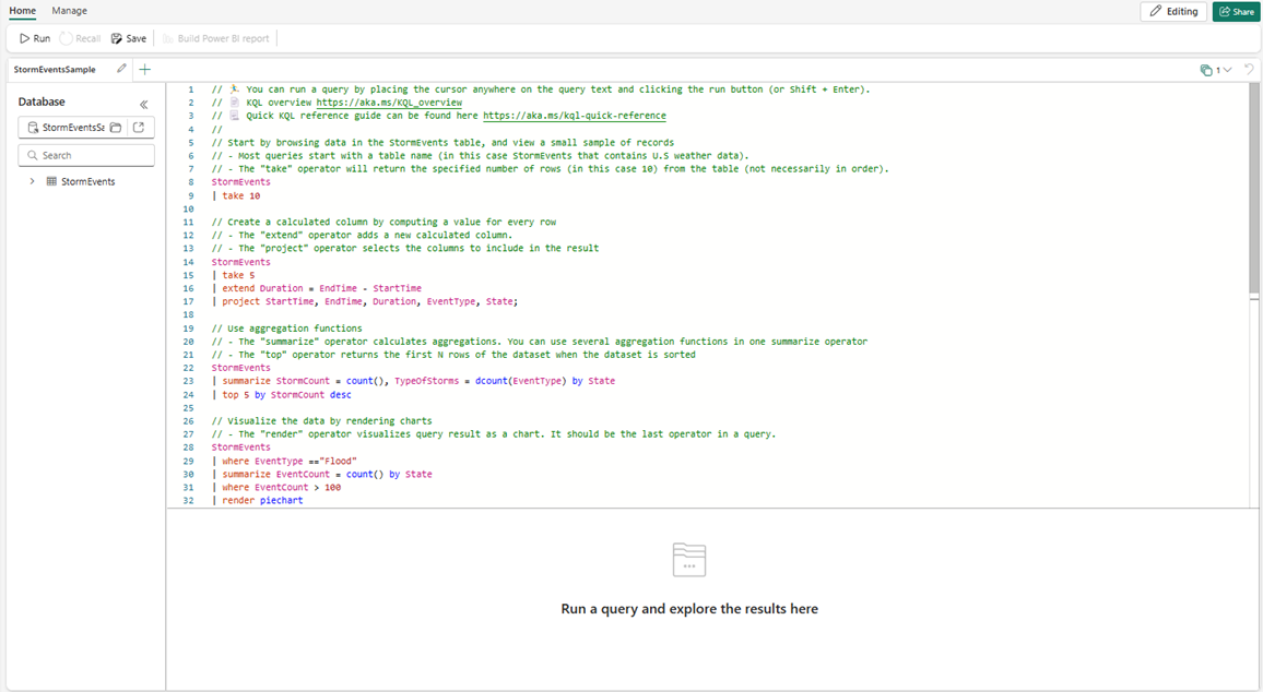 Skjermbilde av et eksempel på KQL-spørringssett som viser eksempelspørringer for Tabellen Storm-hendelser.