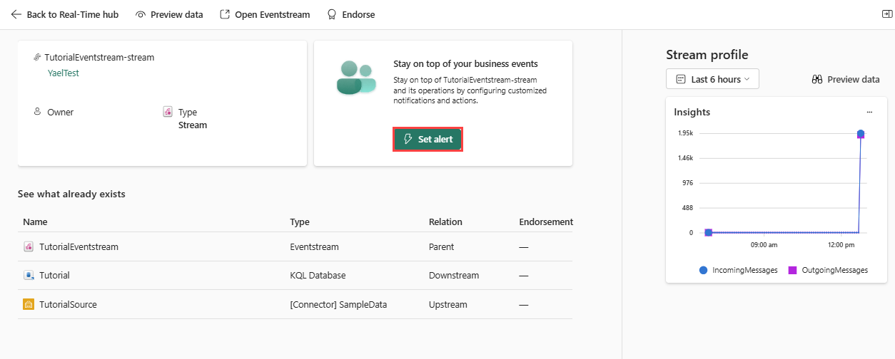 Velg TutorialEventstream-hendelsesstrømmen du opprettet i forrige veiledning. Detaljsiden for eventstream åpnes.