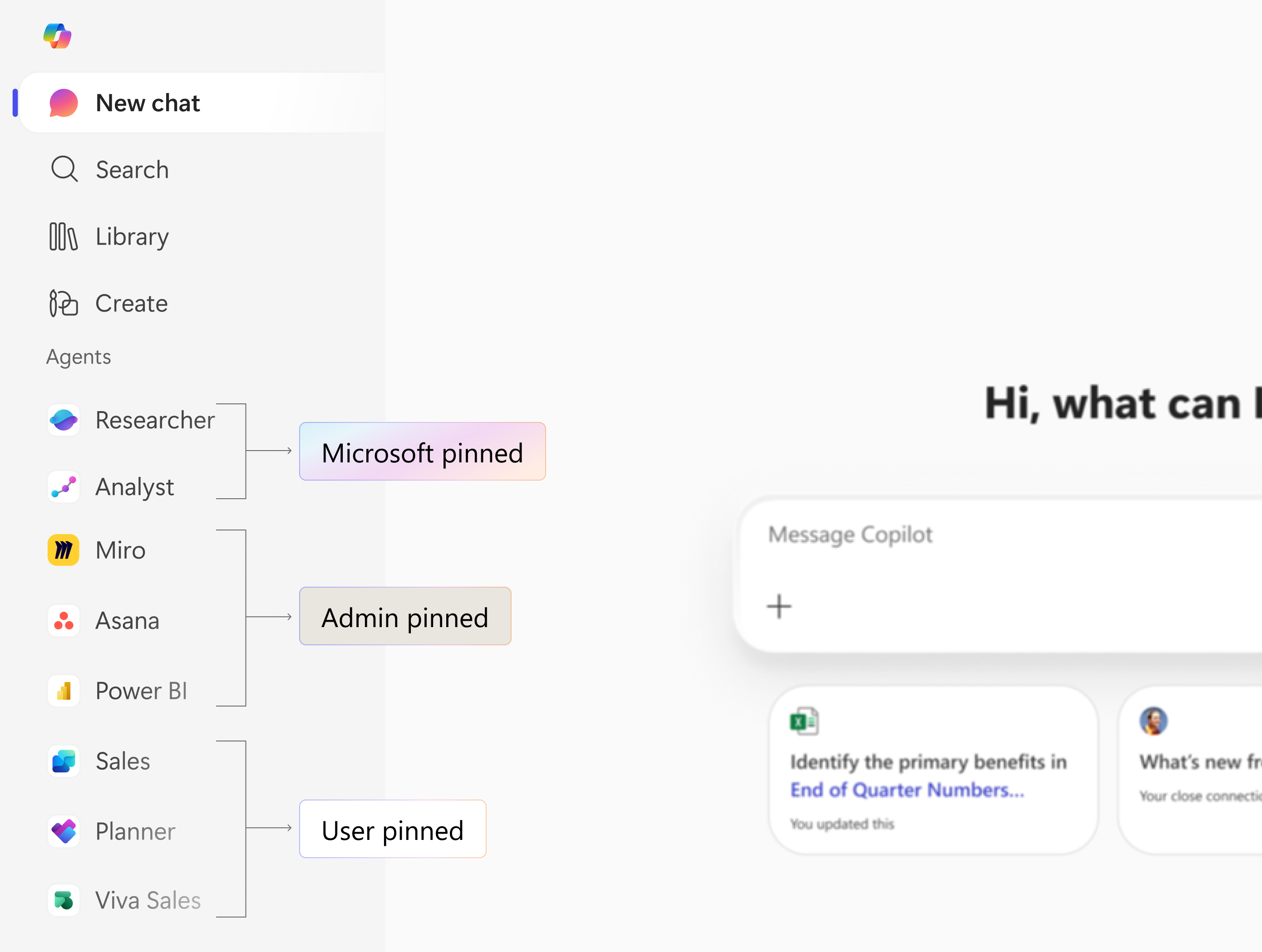 Microsoft 365 Copilot inkluderer agenter som er festet av Microsoft, administratorer og brukere. Microsoft-festede agenter er spesifikke agenter som er festet som standard for alle brukere. Admin festede agenter festes av deg eller organisasjonen ved hjelp av Copilot-kontrollsystemet i Administrasjonssenter for Microsoft 365. Bruker festede agenter festes av individuelle brukere i sine egne Microsoft 365 Copilot Chat eller Microsoft 365 Copilot opplevelse.