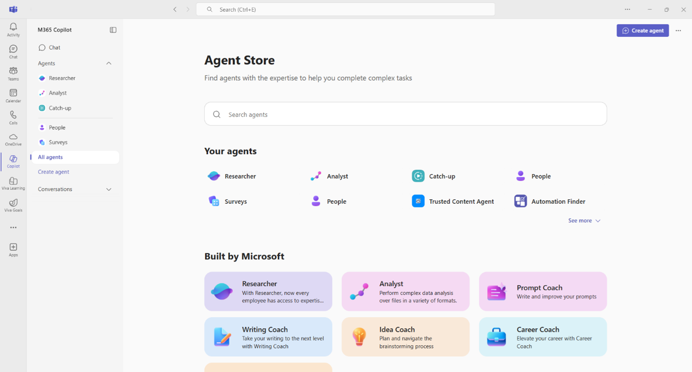 Medlemmer av organisasjonen kan installere agenter fra Agent Store. Med tanke på verktøyene og funksjonaliteten kan de også opprette agenter ved hjelp av Copilot Studio, Agent Builder og SharePoint. Hvis du vil ha relatert informasjon, kan du se Brukerinstallerte agenter og Innstillinger for agentdeling og publisering.