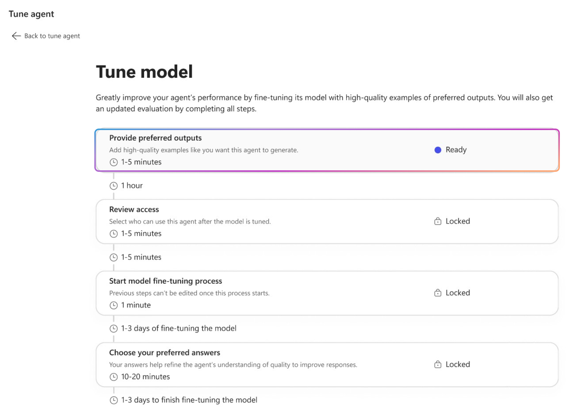 Modelljustering fokuserer på å forbedre resonnerings- og utgangskvaliteten gjennom overvåkede finjusterings- og forsterkningslæringsteknikker. Eksempler på høy kvalitet fra organisasjonsdata brukes som opplæringsinndata, med evalueringsrubrikker som veileder justeringen til organisasjonens forventninger. I løpet av denne prosessen kan du bruke tilgangskontroller, filtillatelser og følsomhetsetiketter. Modelljustering kjører asynkront, slik at brukere kan fortsette å bruke den eksisterende agenten mens justering pågår. Når justeringen er fullført, avgjør evalueringsresultatene om den oppdaterte modellen er klar til å publiseres.