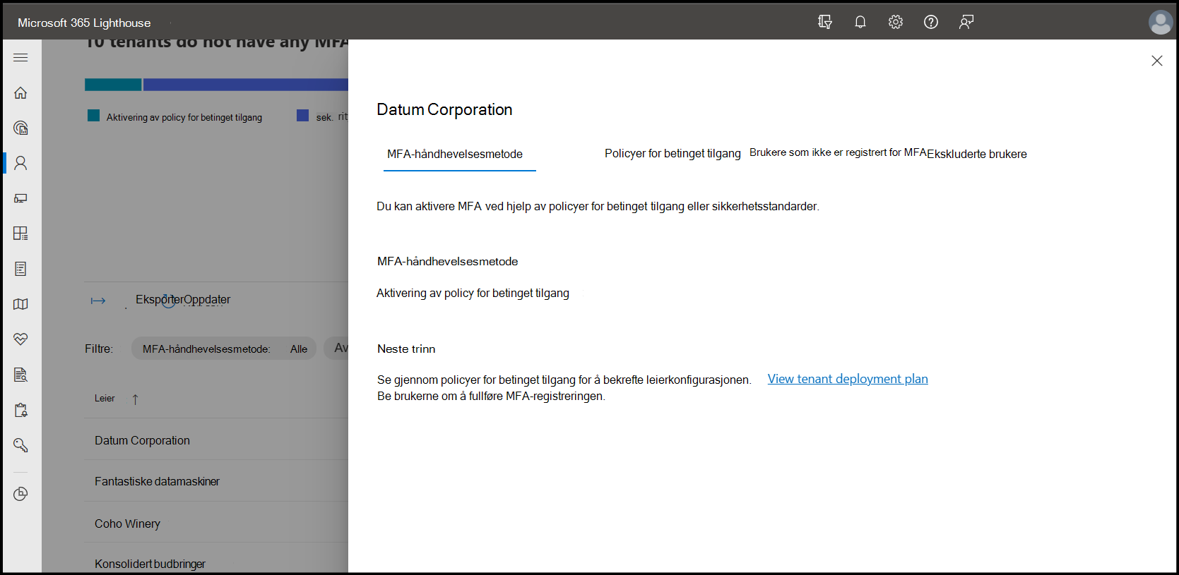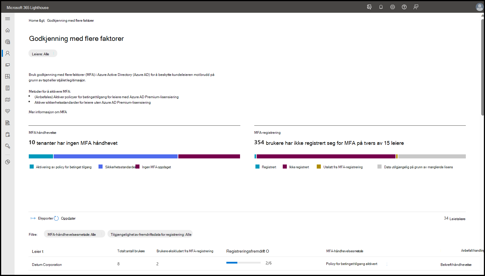 Fanen inneholder leierspesifikke detaljer rundt leierens MFA-aktiveringsmetode, koblinger til tilleggsinformasjon og de neste trinnene som bør utføres for å optimalisere leiersikkerhet.