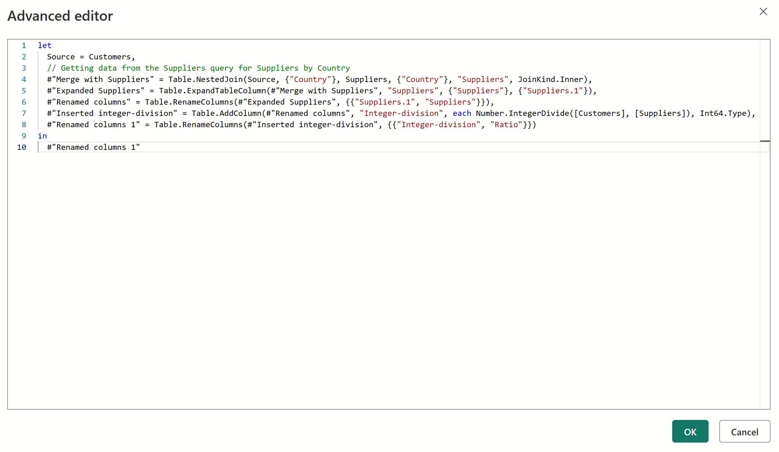 Hvis du vil observere koden som Power Query-editoren lager for hvert steg, eller vil lage din egen forming-kode, kan du bruke den avanserte editoren. For å åpne advanced editor, velg fanen View på båndet, og velg deretter avansert redigering. Det vises et vindu som viser den eksisterende spørringskoden.