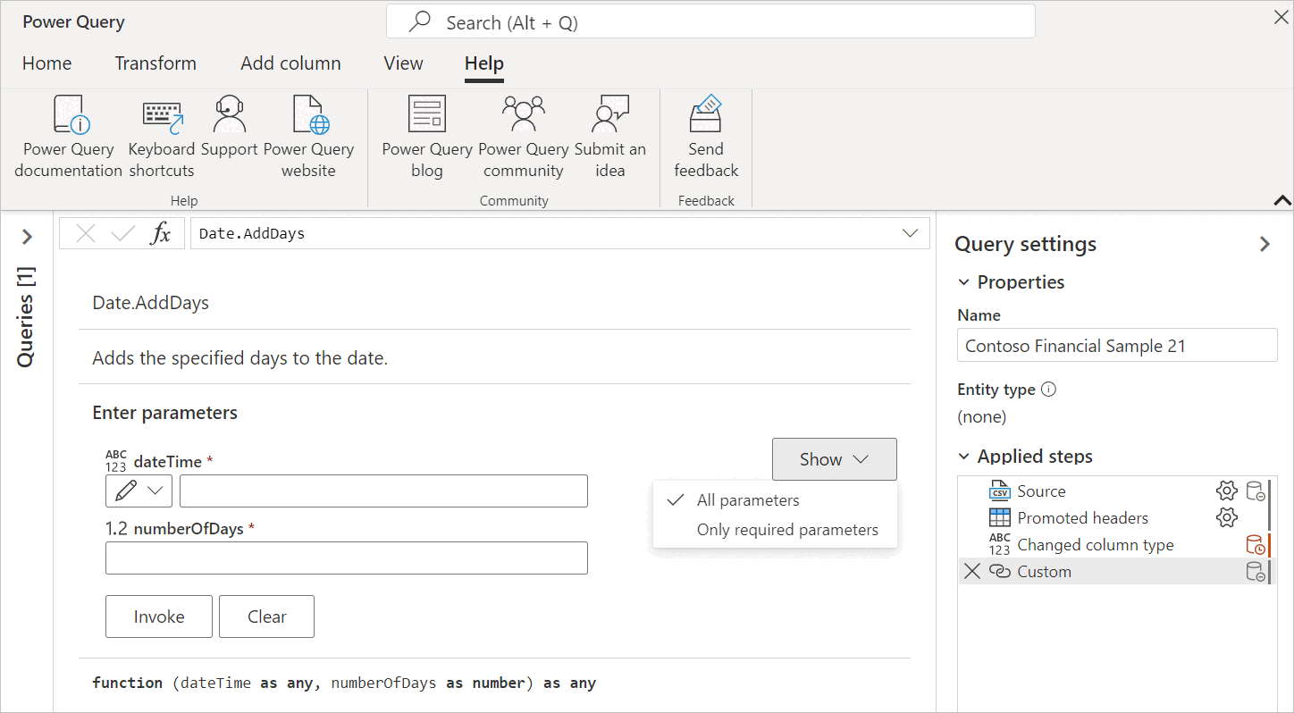 I tillegg til Power Query-hjelpefunksjonene som er nevnt i de forrige avsnittene, kan du også få hjelp til individuelle M-funksjoner fra Power Query-editoren. Fremgangsmåten nedenfor beskriver hvordan du får tilgang til denne innebygde hjelpen.