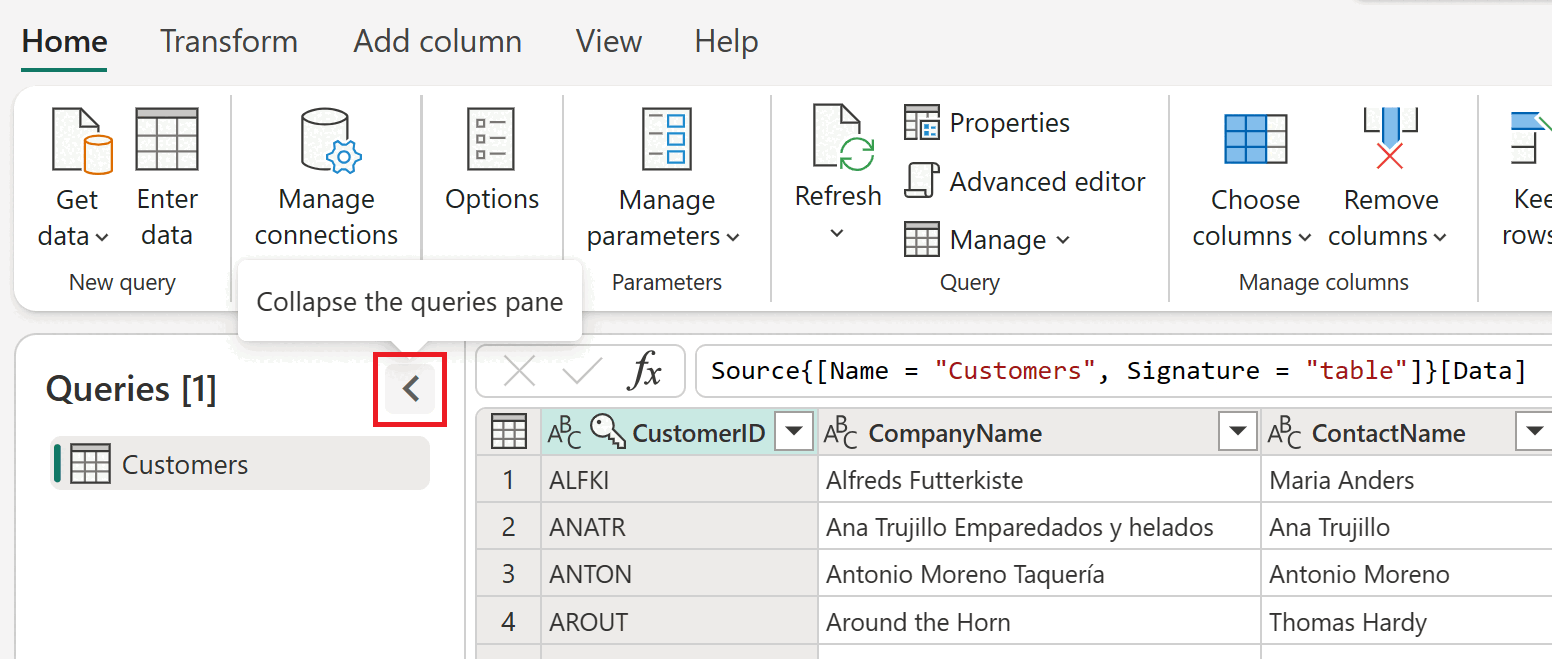 Du vil kanskje legge merke til at det gjennom hele Power Query-brukergrensesnittet finnes ikoner som hjelper deg å slå sammen eller utvide visse visninger eller seksjoner. Det er for eksempel et ikon øverst til høyre i Spørringer-ruten som skjuler spørringsruten når den er valgt, og utvider ruten når den er valgt på nytt.
