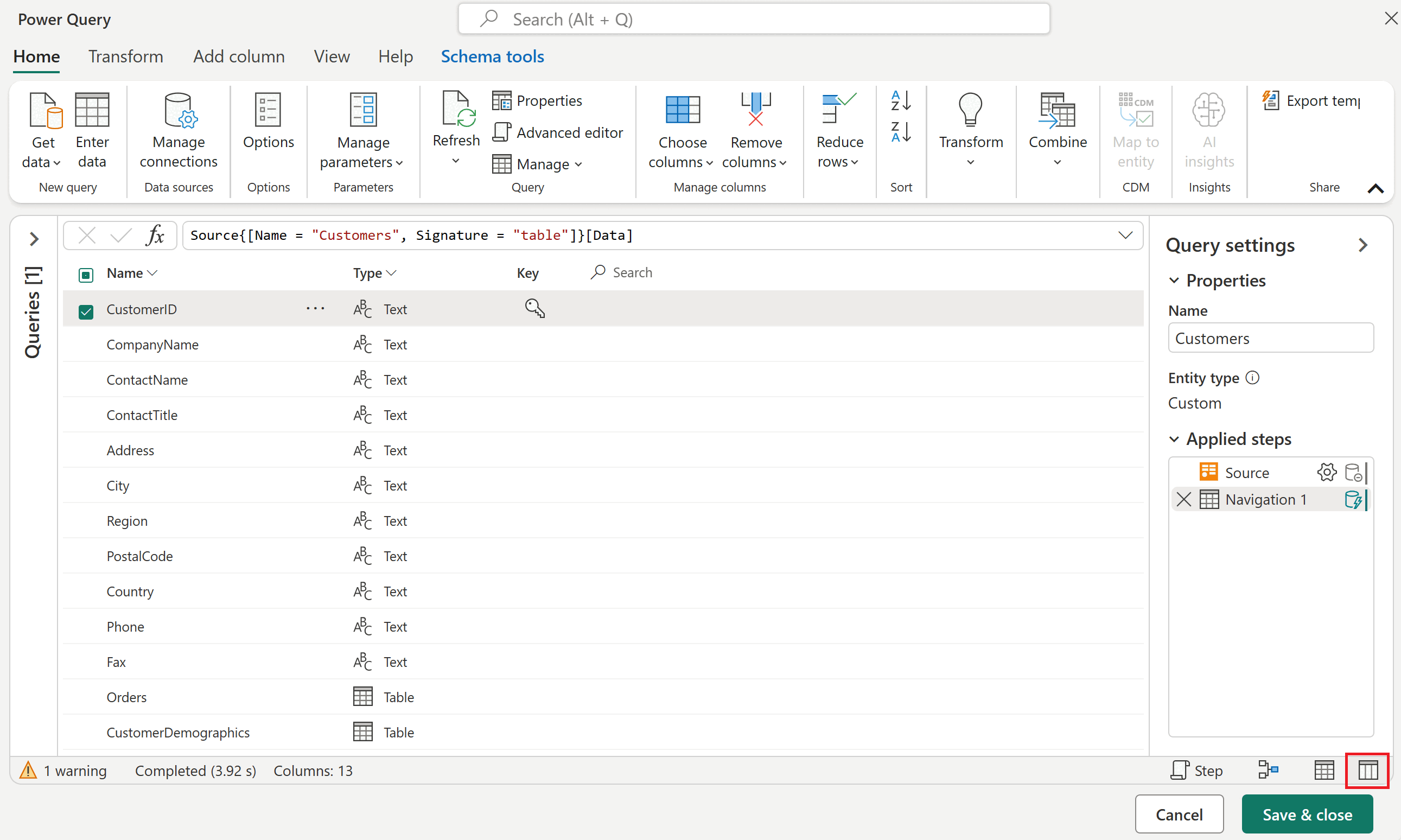 Skjemavisningen gir deg en rask og enkel måte å samhandle med komponentene i skjemaet for tabellen på, for eksempel kolonnenavnene og datatypene. Vi anbefaler skjemavisningen når du vil utføre skjemarelaterte handlinger. Disse handlingene kan være å fjerne kolonner, gi nytt navn til kolonner, endre kolonnedatatyper, endre rekkefølgen på kolonner eller duplisere kolonner.