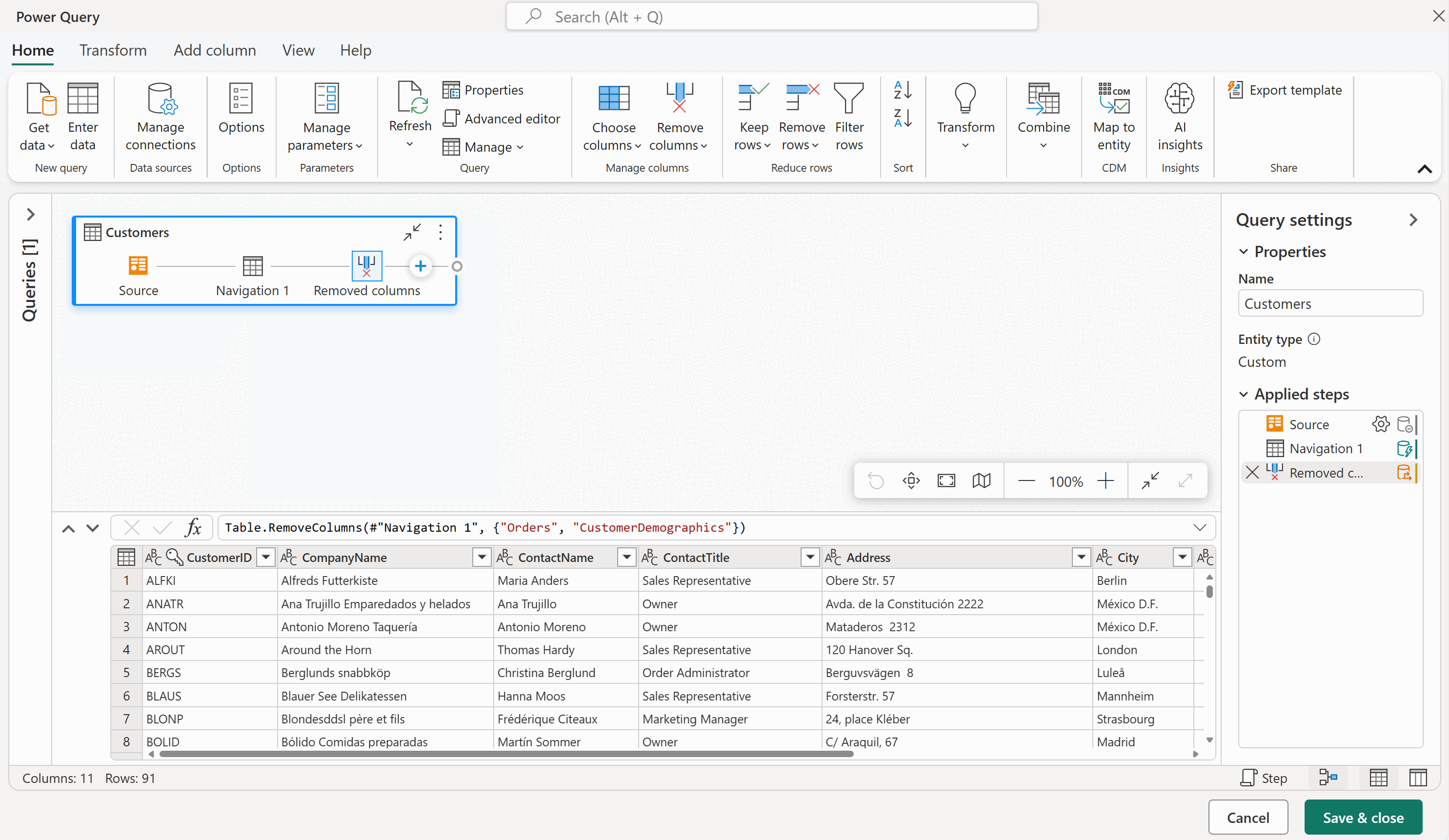 Merk for eksempel av for Ordrer og CustomerDemographics kolonner i skjemavisning, og velg Fjern kolonner handling fra båndet. Dette valget bruker en transformasjon for å fjerne disse kolonnene fra dataene.