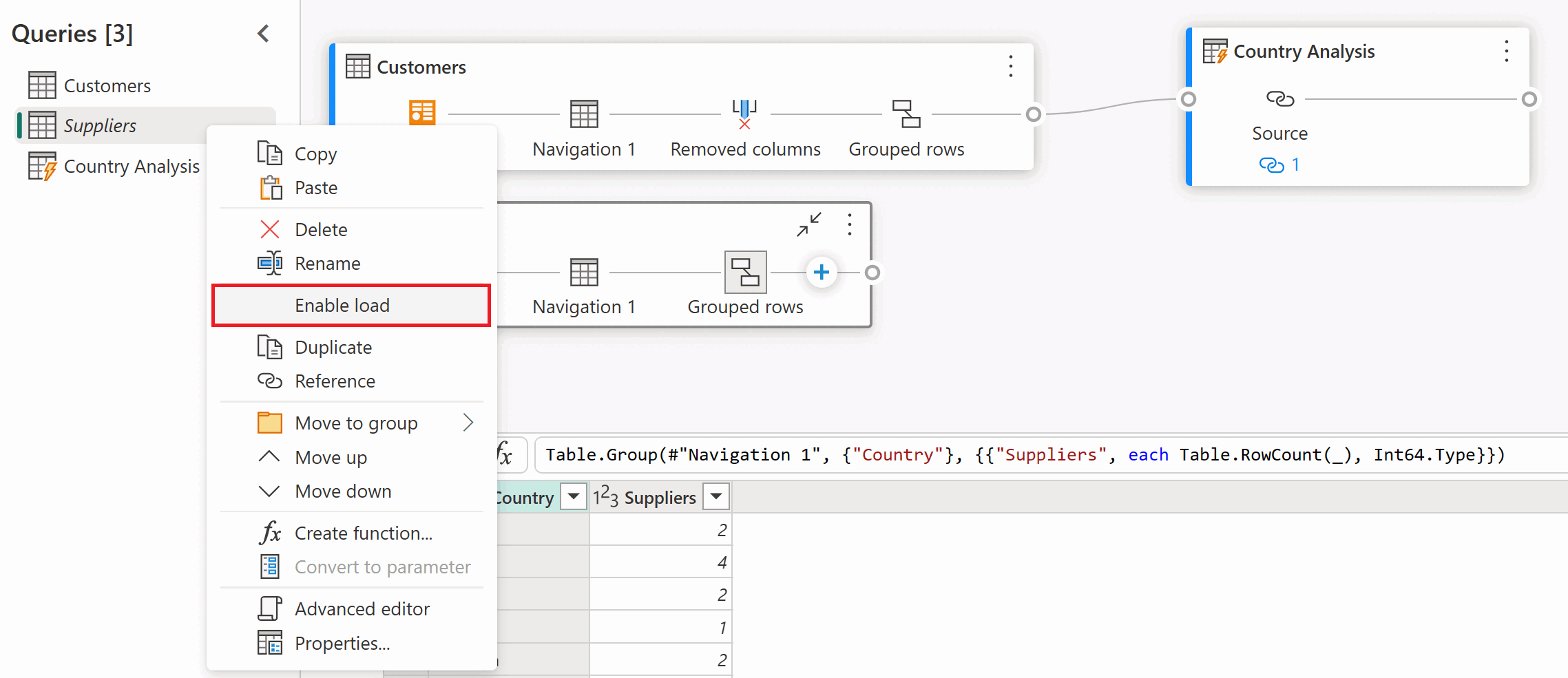 Når du har opprettet denne nye spørringen, endrer du navnet på spørringen for å landanalyse og deaktiverer belastningen av kunder tabellen ved å fjerne alternativet Aktiver innlasting fra leverandører spørring.