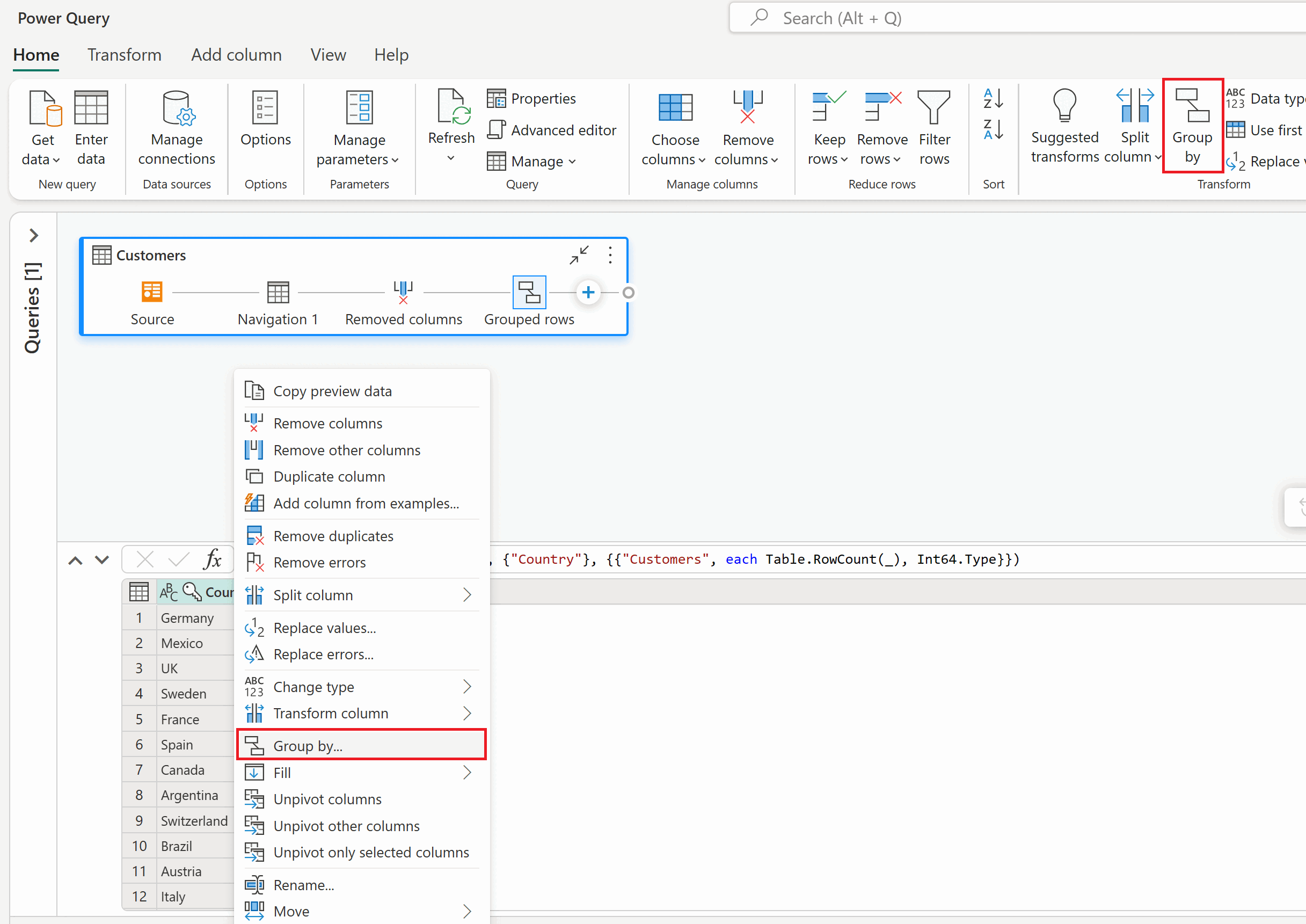 Velg OK for å utføre operasjonen. Forhåndsvisningen av data oppdateres for å vise totalt antall kunder etter land.