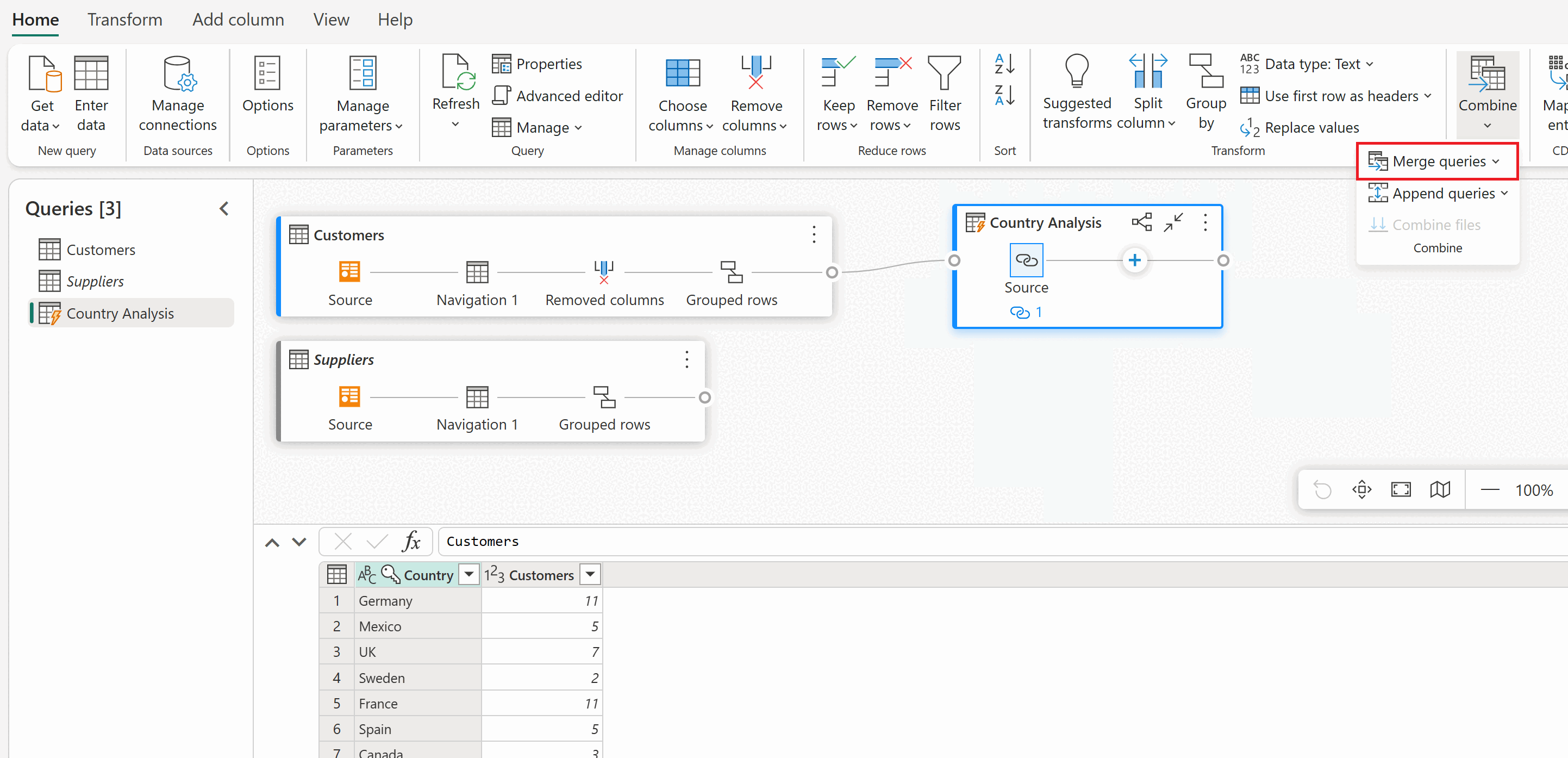 Velg alternativet Slå sammen spørringer fra Hjem-fanen på båndet i Landanalyse-spørringen.
