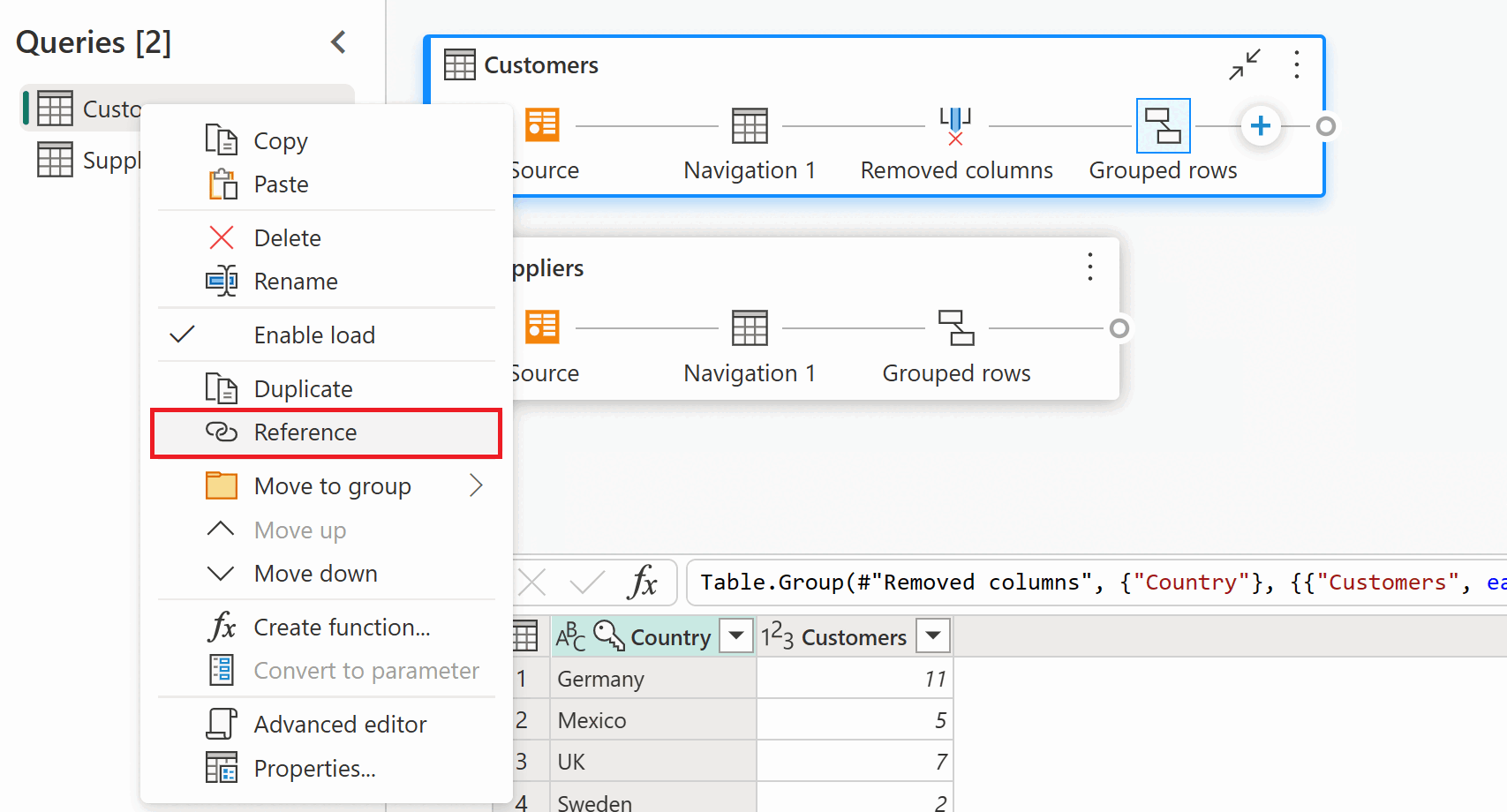 Nå som du har en spørring for kunder og en spørring for leverandører, er det neste målet å kombinere disse spørringene til én. Det finnes mange måter å oppnå dette på, inkludert å bruke alternativet Slå sammen i Kunder-tabellen, duplisere en spørring eller referere til en spørring. I dette eksemplet oppretter du en referanse ved å velge og holde (høyreklikke) Kunder tabellen og velge Referanse, som effektivt oppretter en ny spørring som refererer til Kunder-spørringen.