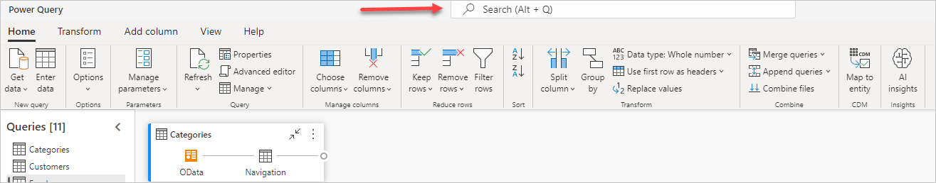 Den globale søkeboksen er plassert øverst i midten av Power Query-redigeringsprogrammet. Søkeboksen følger de samme utformingsprinsippene som du finner i Microsoft Search i Office, men kontekstualisert til Power Query.