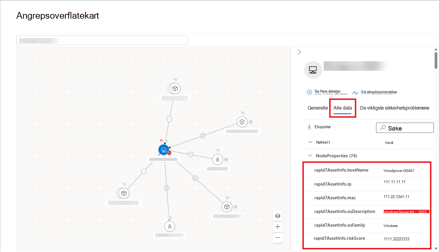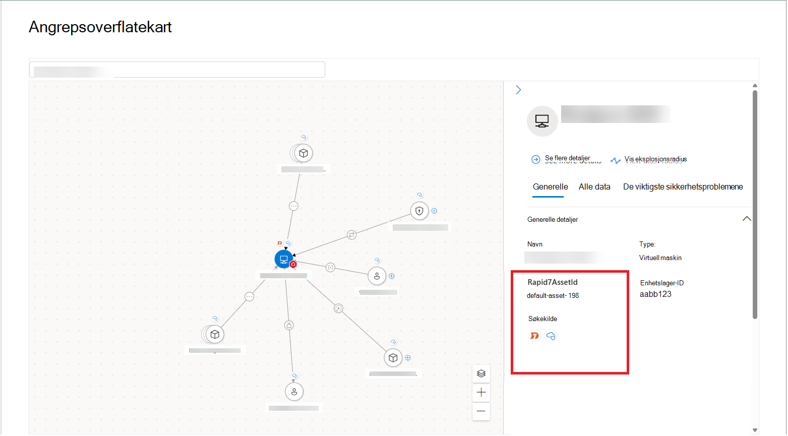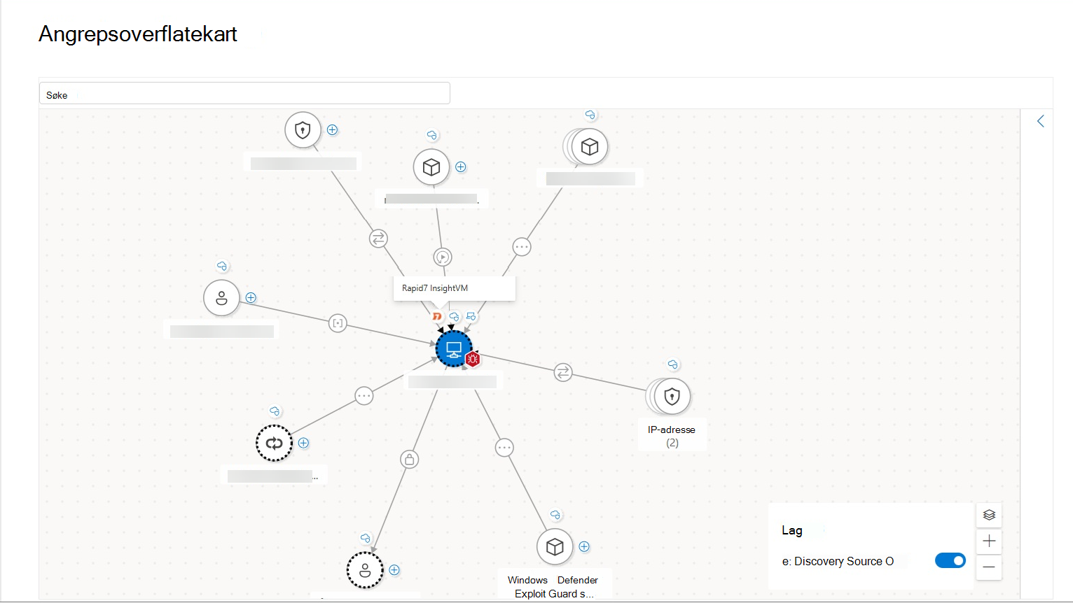Hvis du vil utforske aktiva og berikelsesdata som er hentet fra eksterne dataprodukter, kan du også vise denne informasjonen i Eksponeringsgrafen. I Attack Surface-kartet kan du vise nodene som representerer ressurser som oppdages av koblingene dine, med innebygde ikoner som viser oppdagelseskildene for hver ressurs.