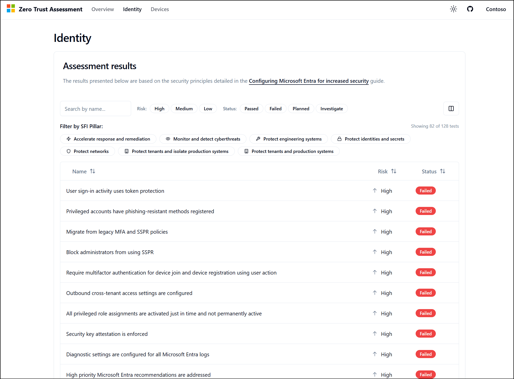 The Identity, Devices, Network, and Data tabs show a list of results from the tests run against the tenant. The results show the Risk and result Status of each test.
