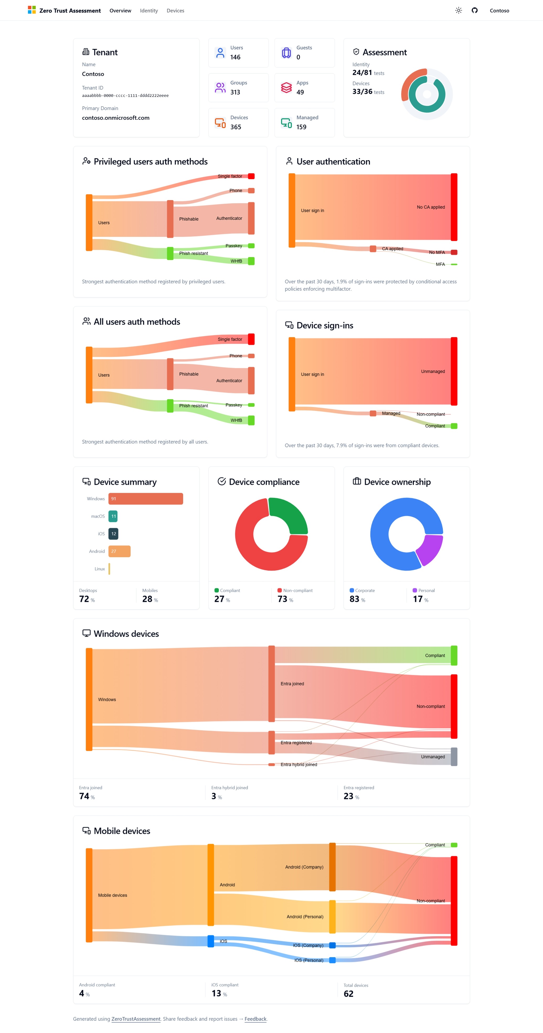 After the assessment runs, the report opens the Overview tab in your default browser. The Overview tab shows key Zero Trust information about the tenant.