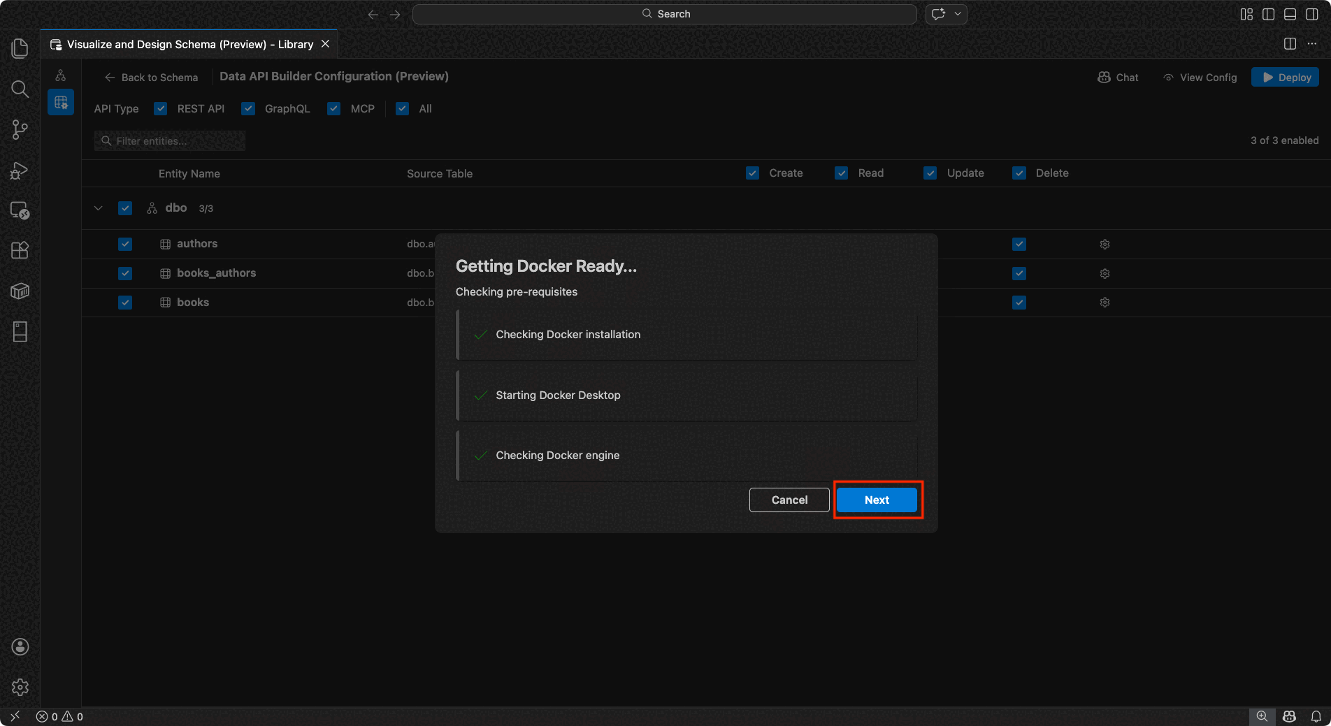 Data API builder deploys as a local Docker container. The deployment wizard guides you through the process: