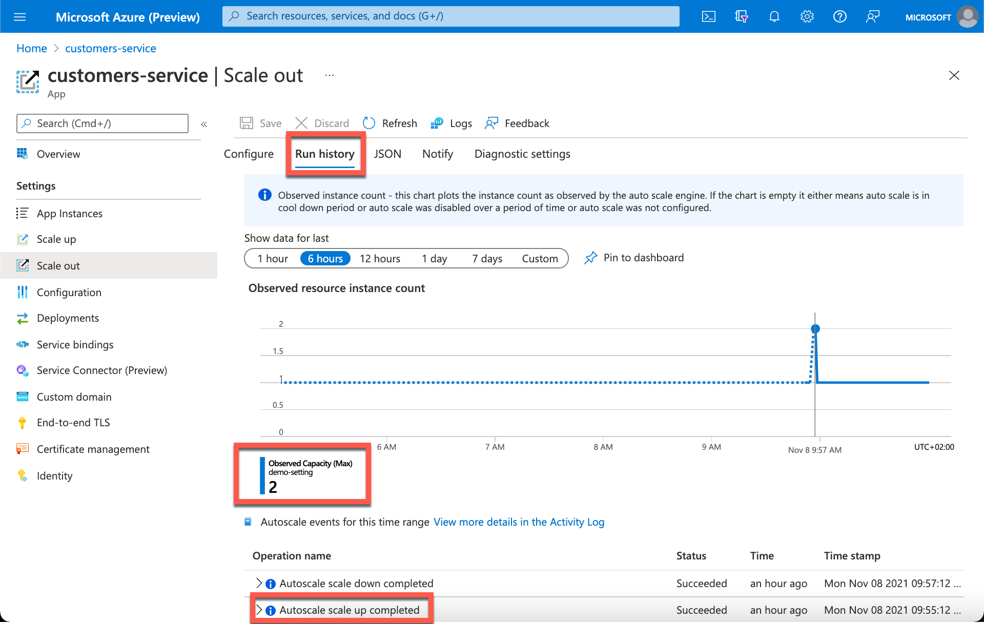 Gå til fanen Kjør logg for å se de nyeste skaleringshandlingene i skjermbildet For å se de nyeste skaleringshandlingene. Fanen viser endringen i Observert kapasitet over tid grafisk, og en logg over hver autoskalahandling.