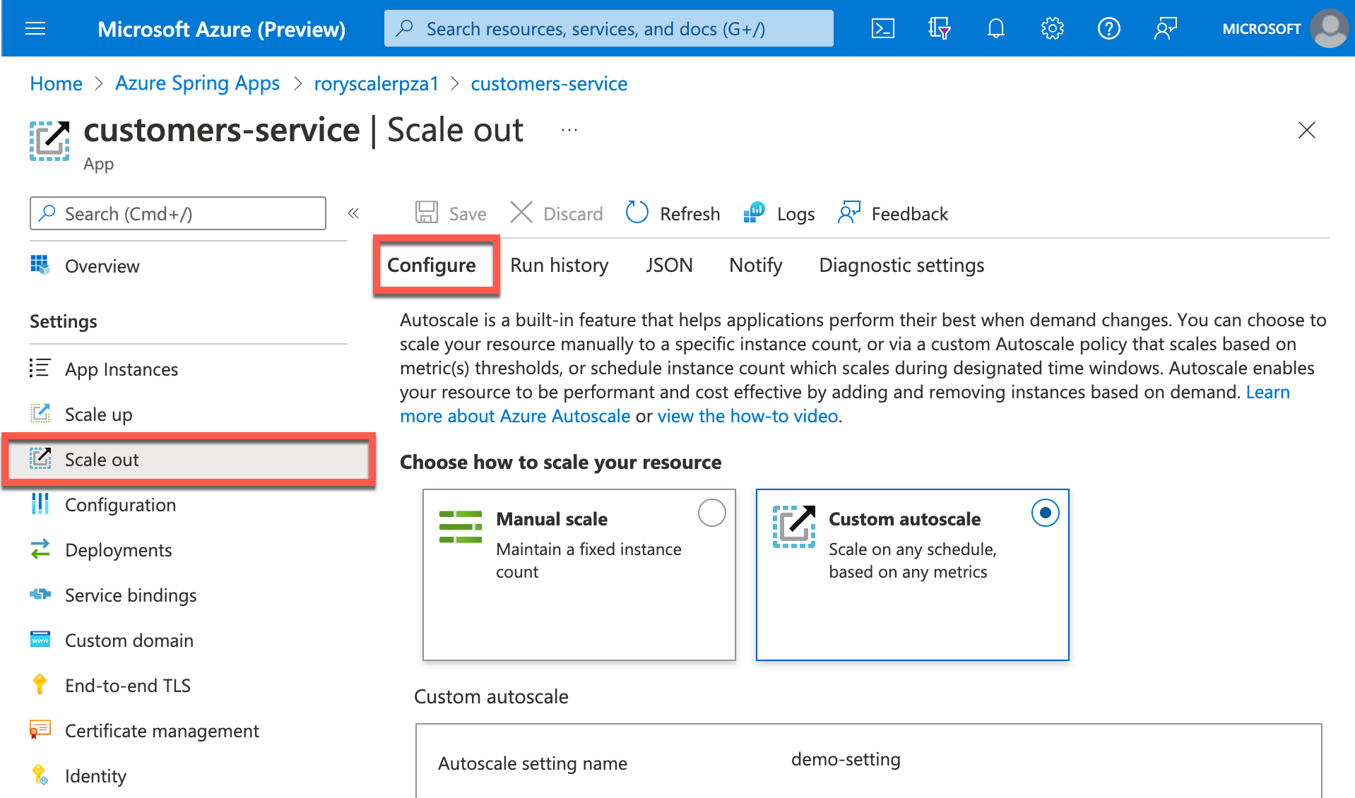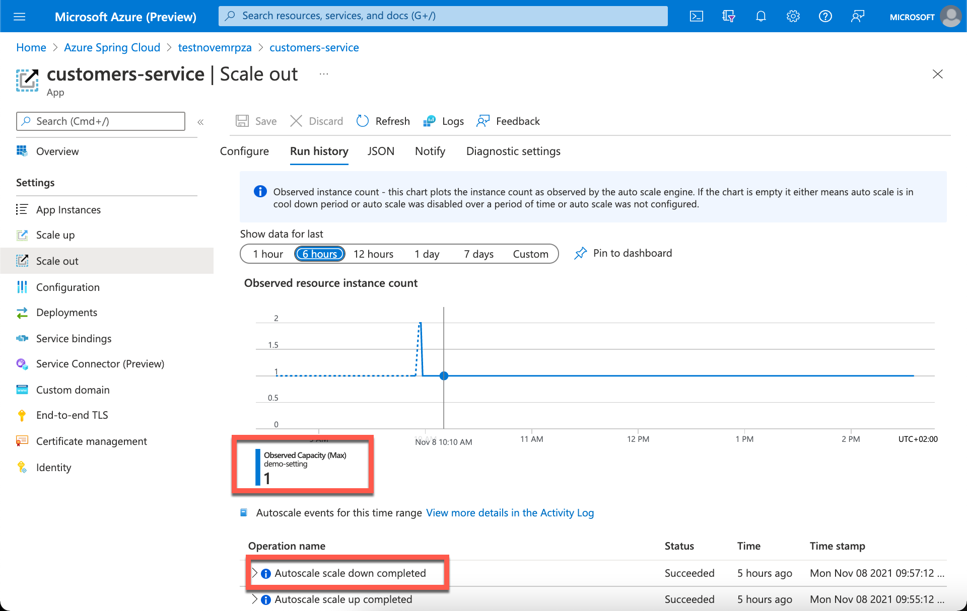 I azure Spring Apps-programmet ditt utløste programmet en utskaleringshandling på kundeservicemikrotjenesten da den ble opprettet.