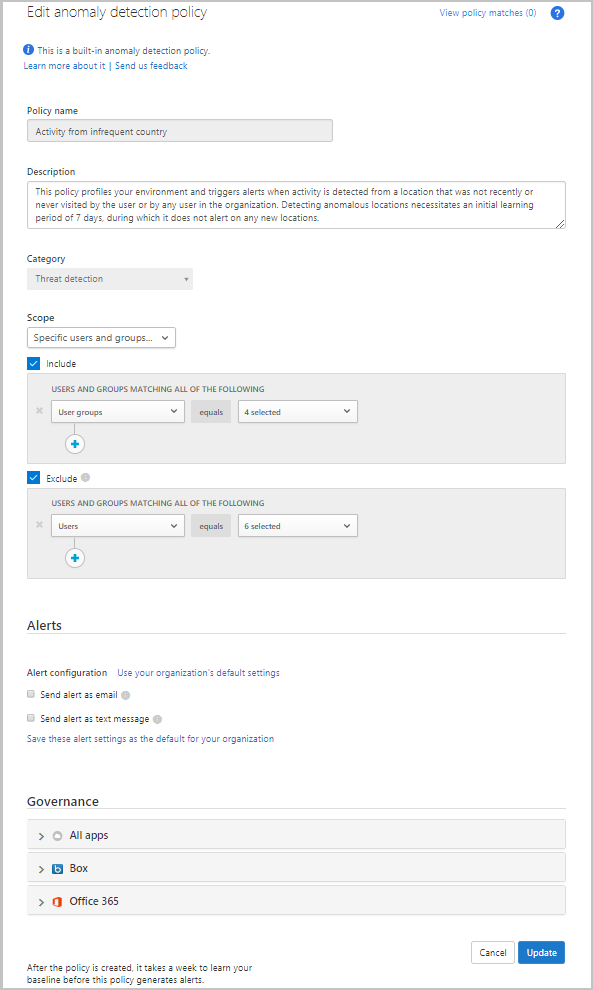 Each anomaly detection policy can be independently scoped so that it applies only to the users and groups you want to include and exclude in the policy. For example, you can set the Activity from infrequent country/region detection to ignore a specific user who travels frequently.
