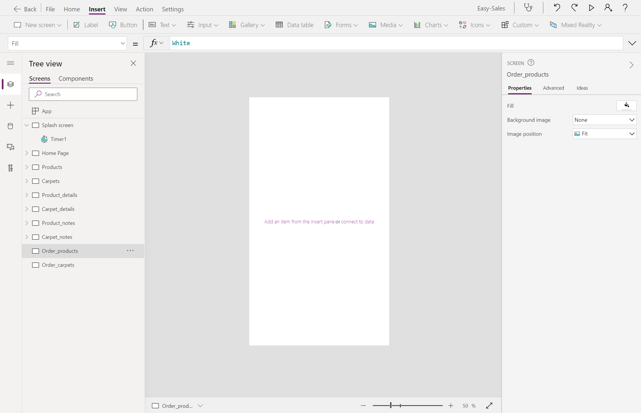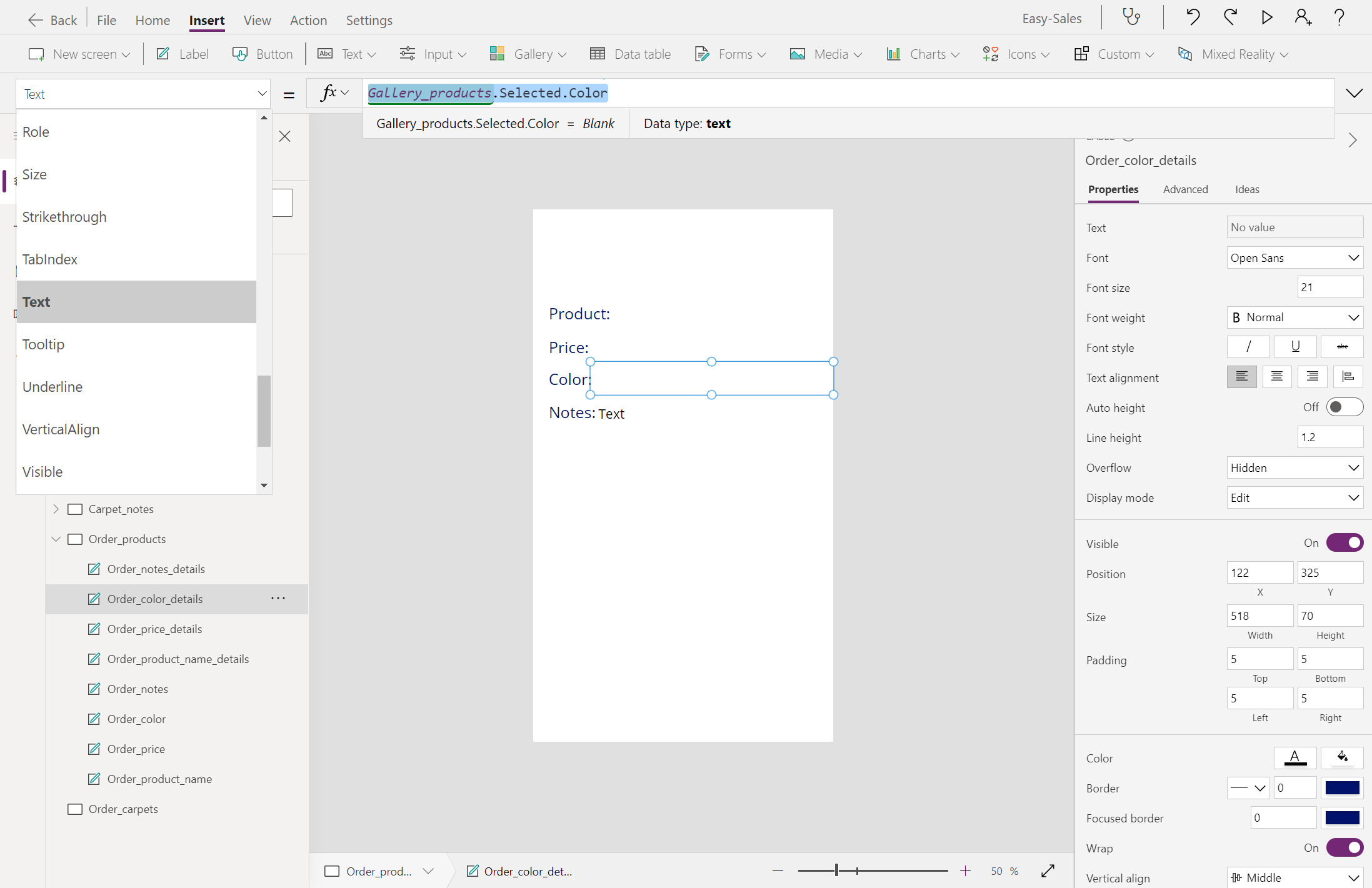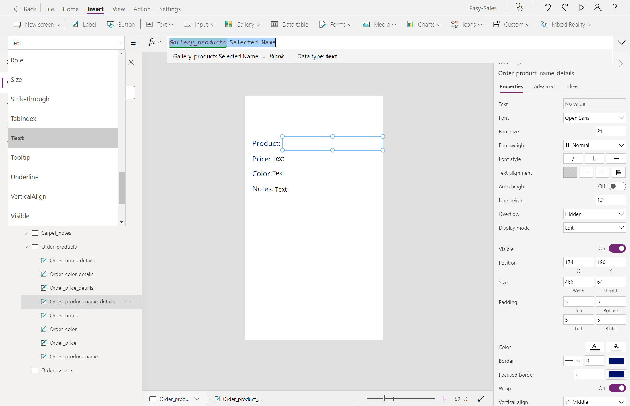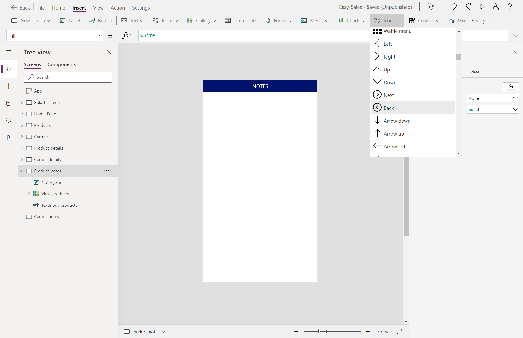 Navigate(Product_details,ScreenTransition.Cover)Bytt til den Product_details skjermen og legg til et notatikon fra rullegardinmenyen Ikoner på Sett inn-fanen .