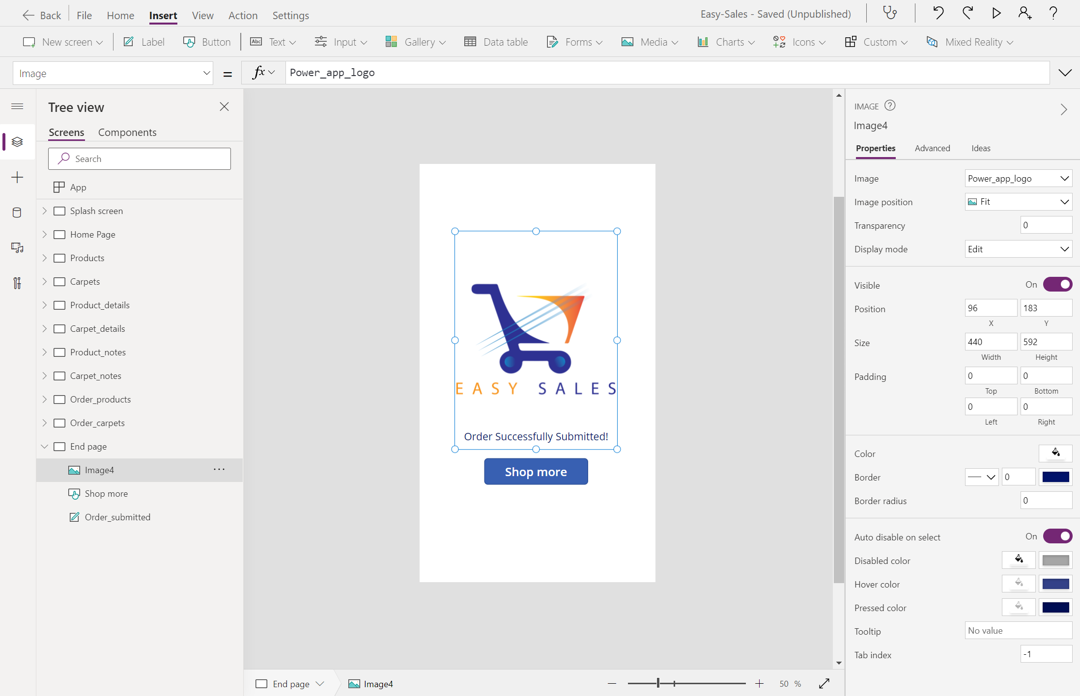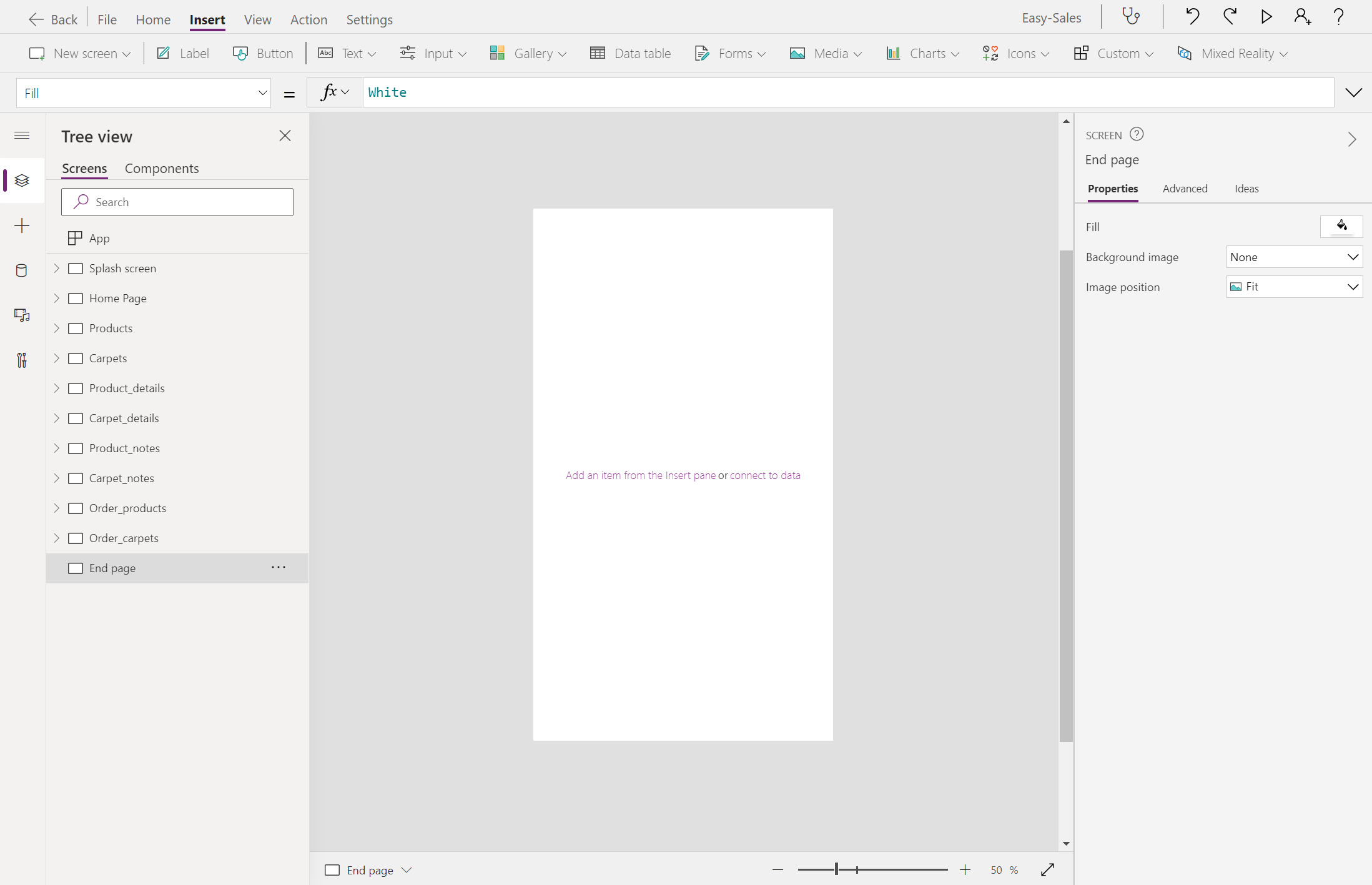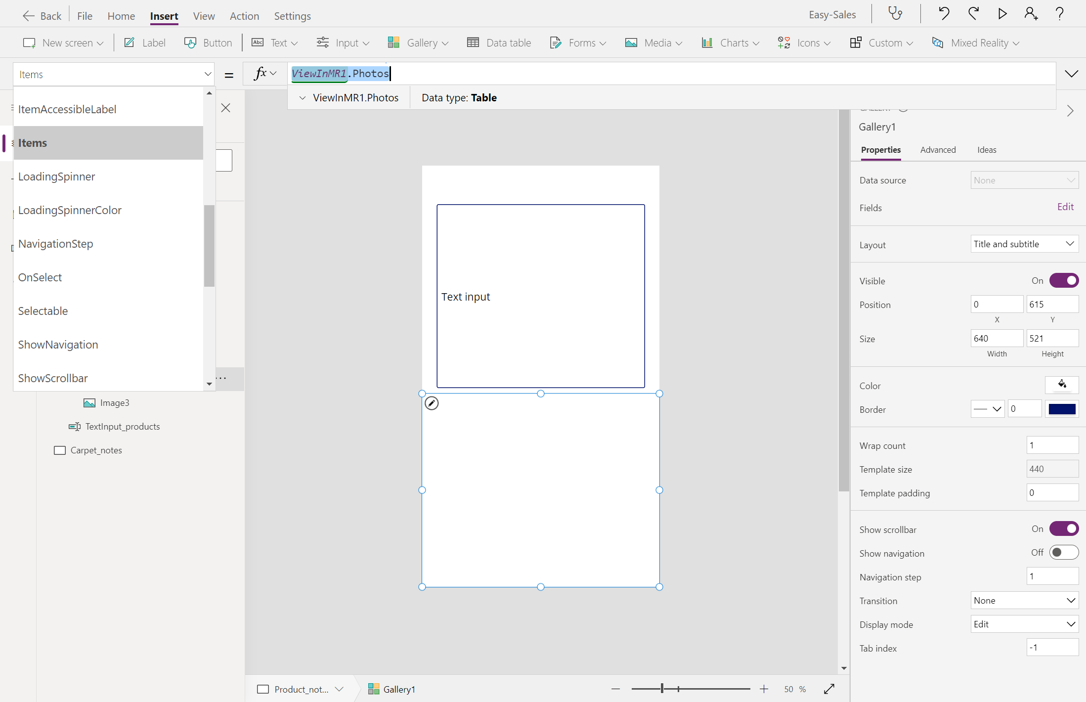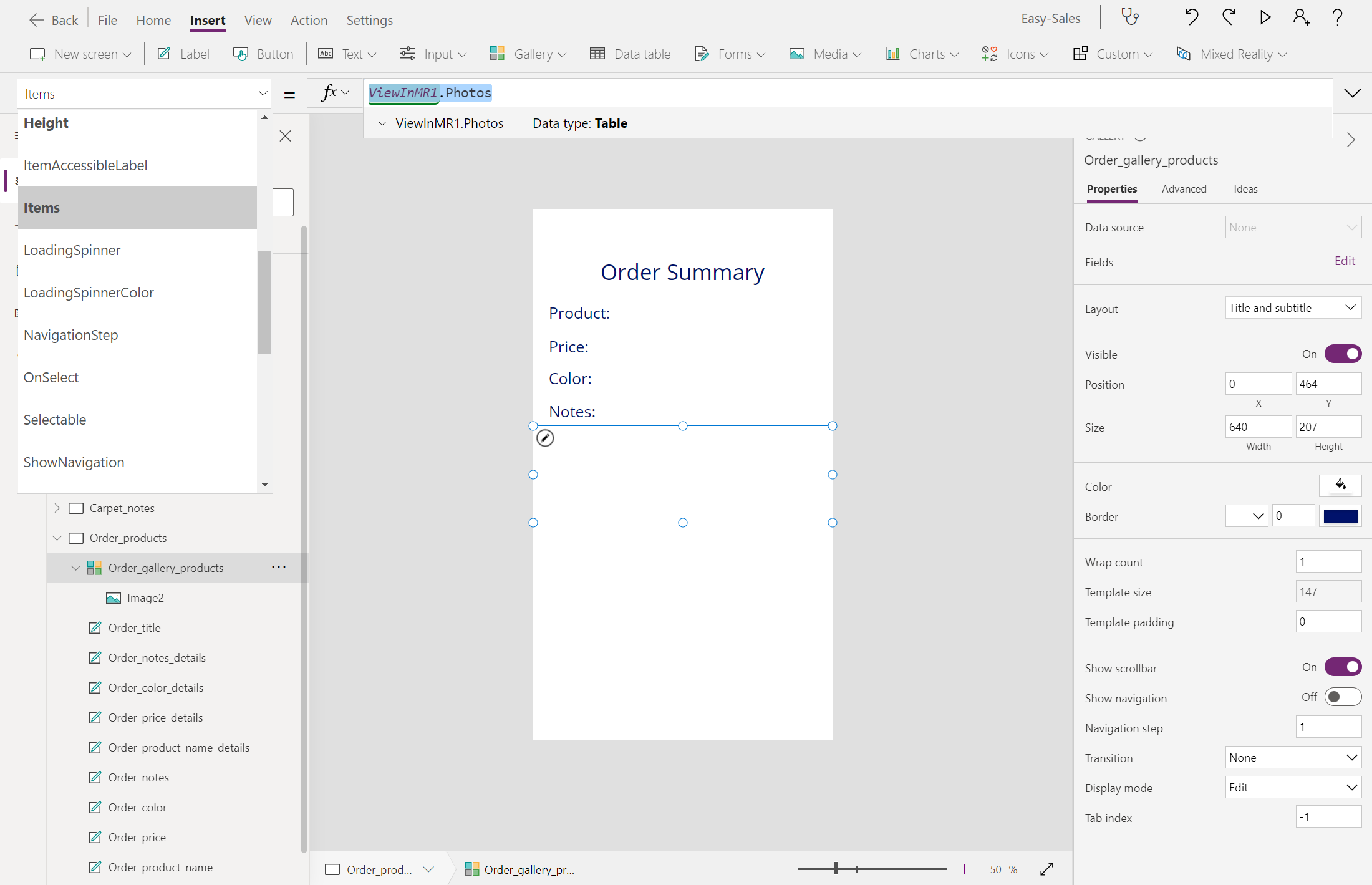 Navigate(Product_details,ScreenTransition.Cover)Bytt til den Product_details skjermen og legg til et notatikon fra rullegardinmenyen Ikoner på Sett inn-fanen .