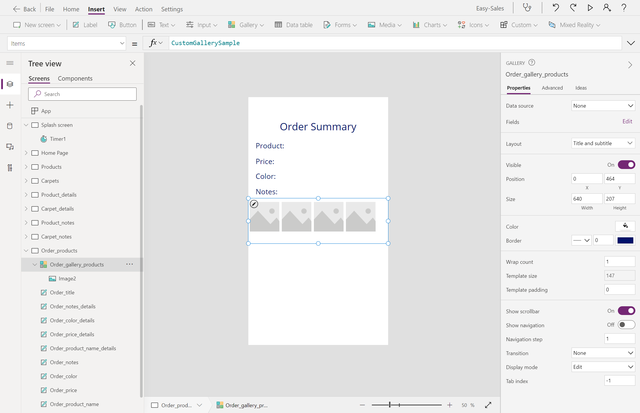 Utvid rullegardinlisten Galleri , og velg Vannrett. Behold bare bildet; slette andre komponenter i galleriet. Gi den nytt navn Order_gallery_products