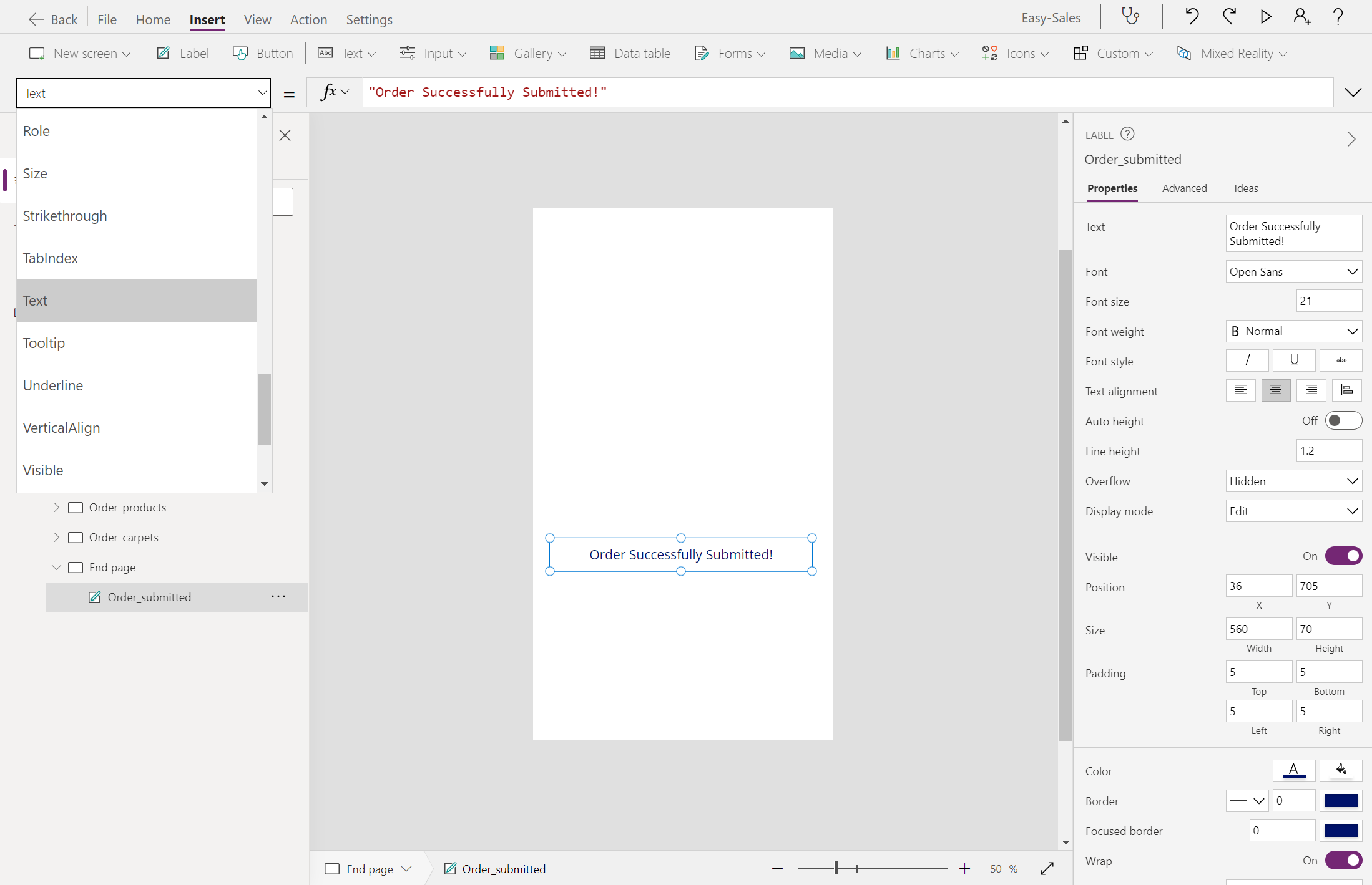 Legg til en etikett og endre visningsteksten til Ordre sendt!. Plasser etiketten etter behov på skjermen.