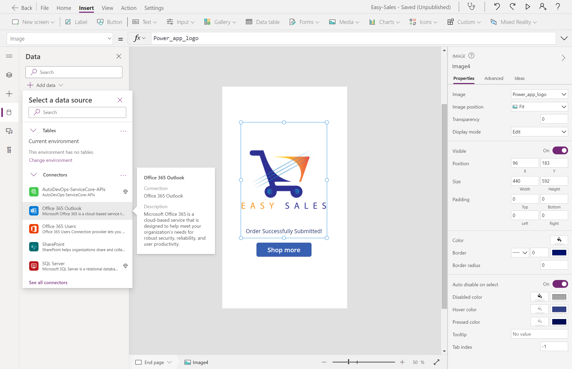 Velg Data-fanen , og velg + Legg til data. Utvid koblingene, og velg deretter Office 365 Outlook for å legge den til som en av koblingene for dette programmet.