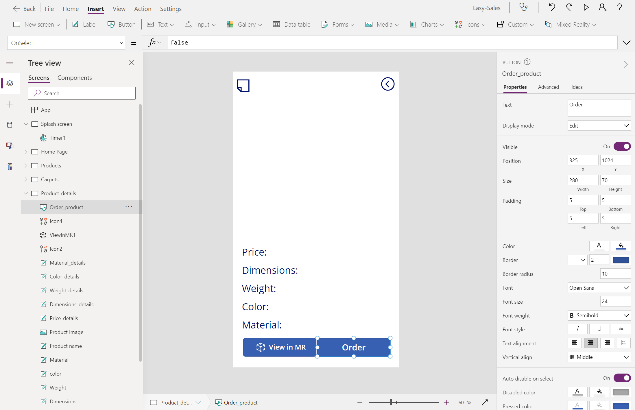 Velg Product_details-skjermen, og konfigurer deretter OnSelect-egenskapen for Ordre-knappen på følgende måte: