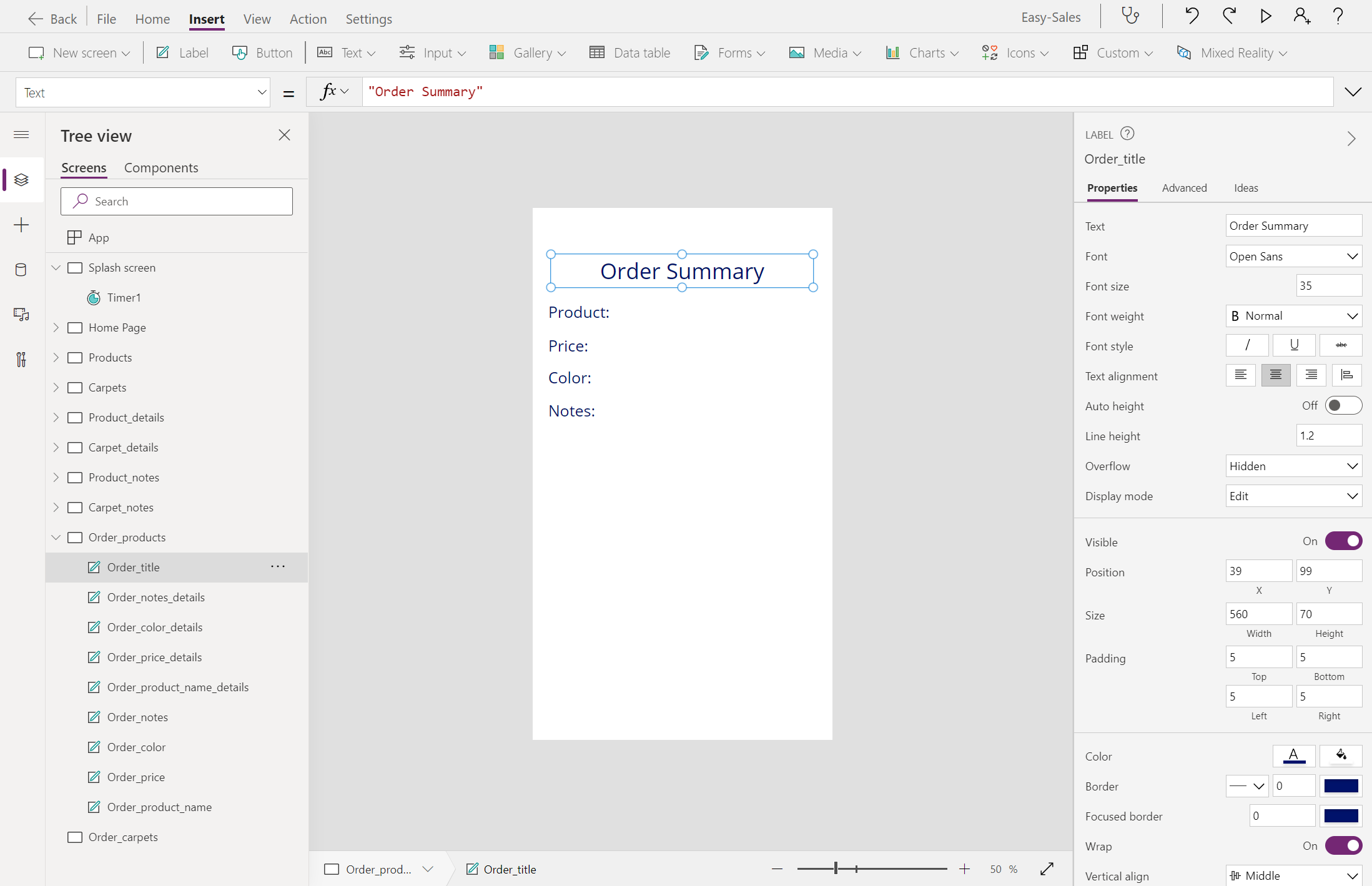 Legg til en annen etikett øverst, og endre visningsteksten til Ordresammendrag. Endre skriftstørrelse og skrift i henhold til dine behov.