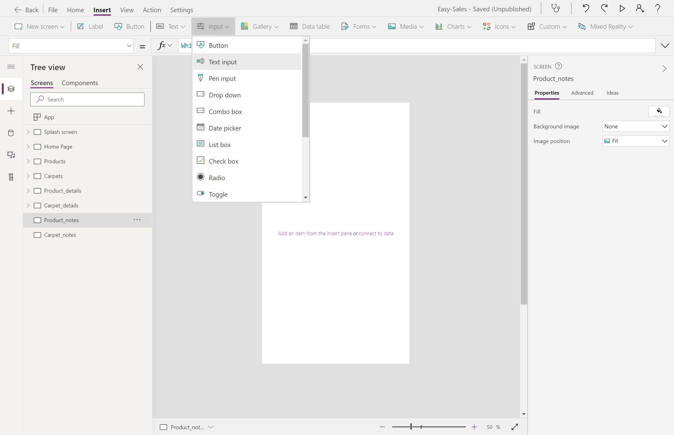 Utform den Product_notes siden: Velg rullegardinlisten Inndata , og velg deretter Tekstinndata. Gi den nytt navn TextInput_products.