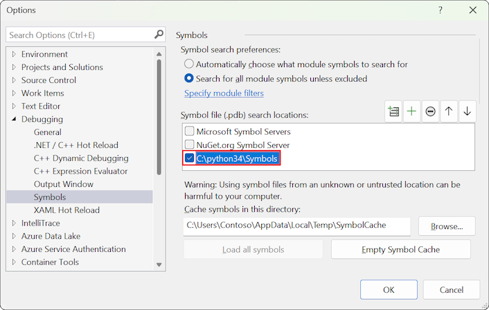 Specify the location where the python.pdb file is located, such as c:\python34\Symbols, as shown in the following image.