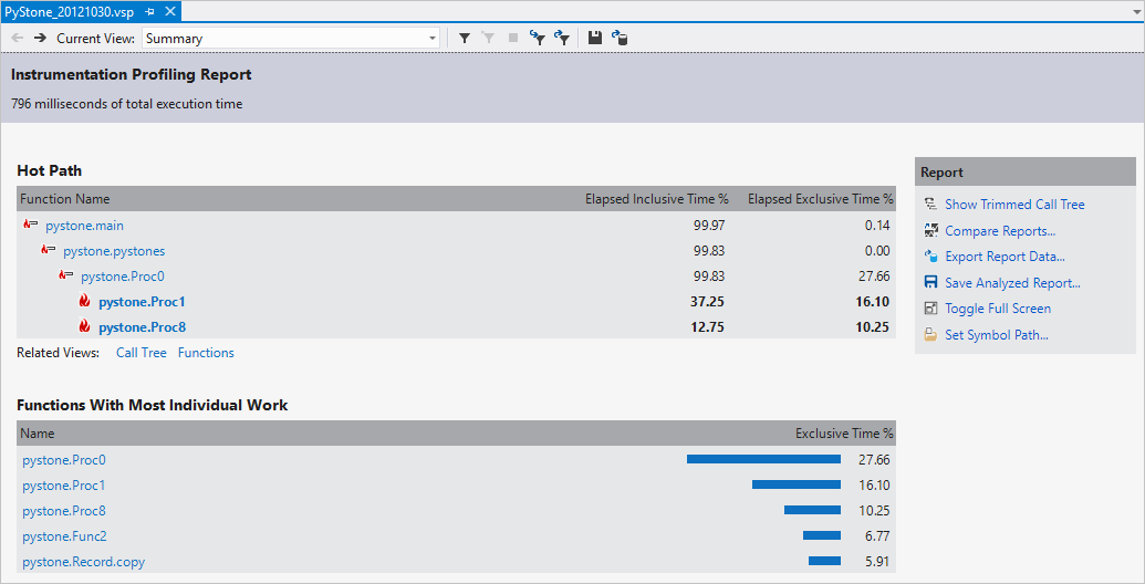 The profiler runs and opens a performance report in Visual Studio. You can review the report to explore how time is spent in your application:
