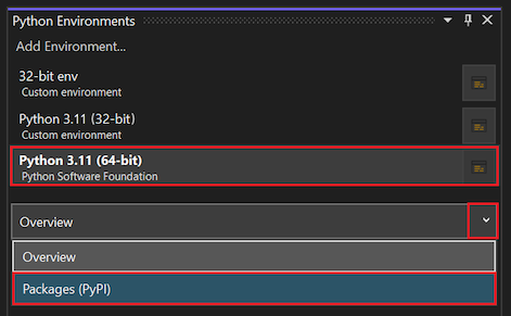 In the Python Environments window, select the default environment for new Python projects, then select Packages (PyPI) in the dropdown menu. (PyPI is the acronym for the Python Package Index.)
