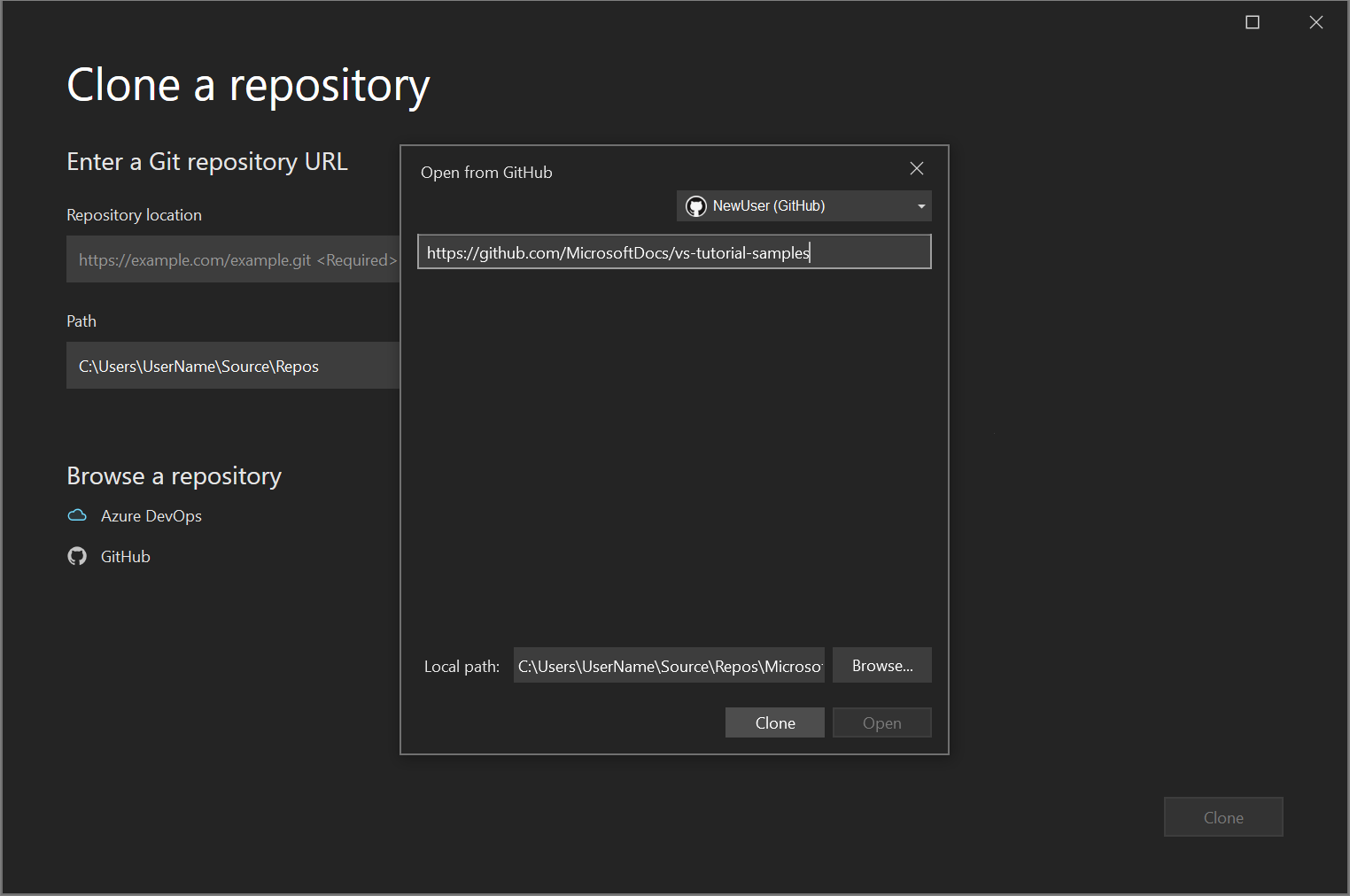 After you sign in, Visual Studio returns to the Clone a repository dialog, where the Open from GitHub window lists all the repositories that you have access to. Select the one you want, and then select Clone.