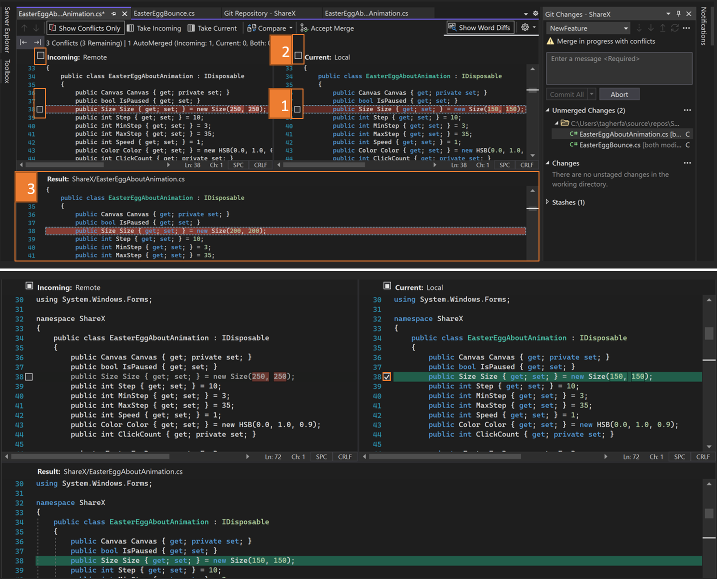 In Merge Editor, start resolving your conflict by using any of the following methods (as depicted in the numbered screenshot):